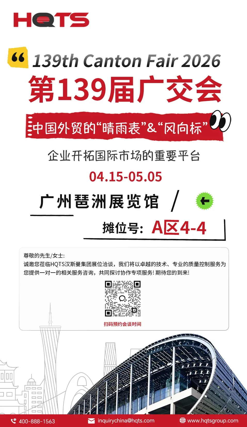 每一期展会,都是一次全新的相遇;每一次相聚,都蕴含着无限的合作可能。第139届广交会二期、三期,HQTS在A区4-4展位恭候新老朋友的光临,让我们携手共进,在全球市场中行稳致远。