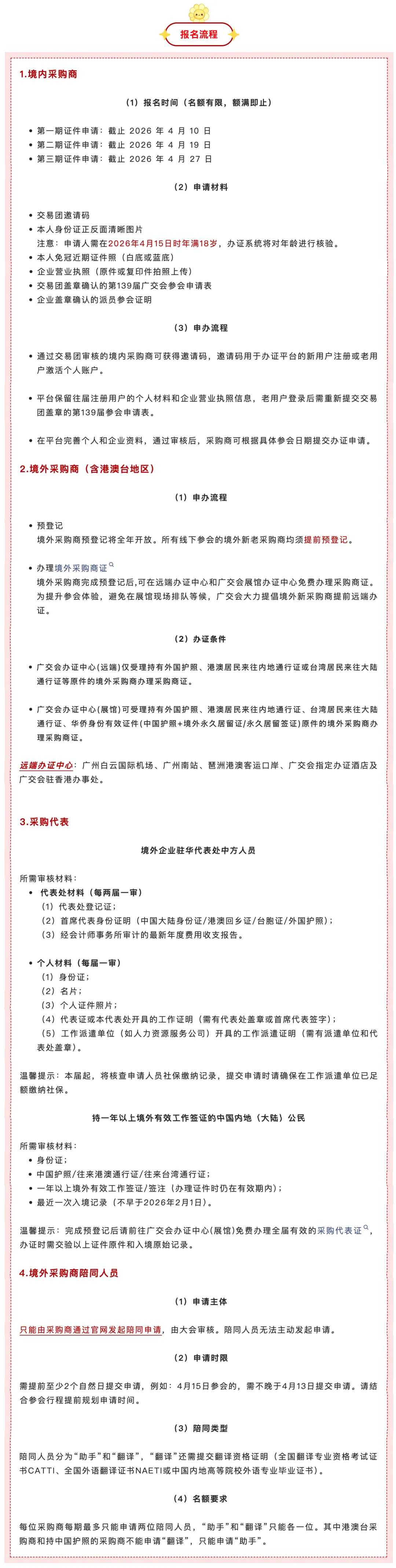 广交会(二期)将于4月20日开幕,距离开展仅剩3天!本次展会对采购商实行实名制预约办证、分身份定向报名制度,无现场售票渠道,境内外采购商及采购代表需按对应身份完成线上预登记与资质审核,方可获取参会证件入场。