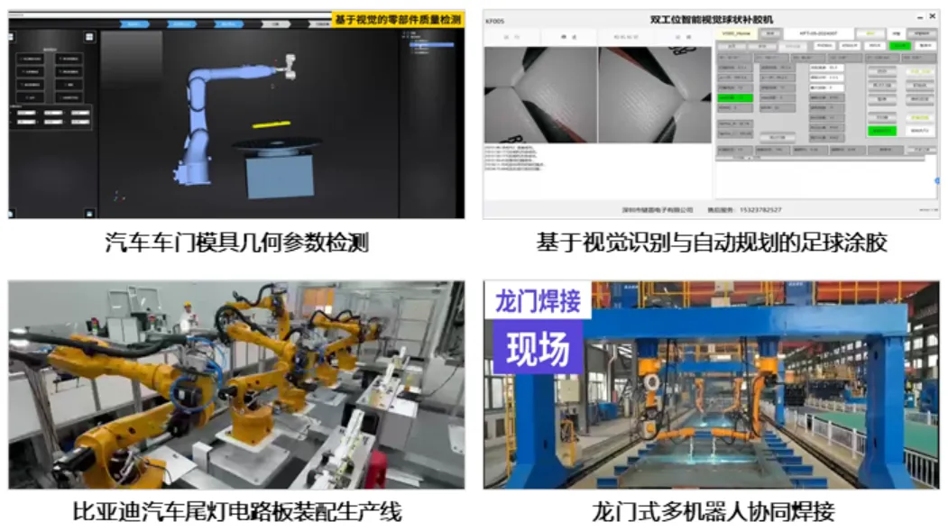 该项成果可应用于船舶焊接、高端装备制造等领域。当前已成功在汽车车门模具几何参数检测、基于视觉识别与自动规划的足球涂胶、比亚迪汽车尾灯电路板装配生产线、龙门式多机器人协同焊接4方面进行应用。