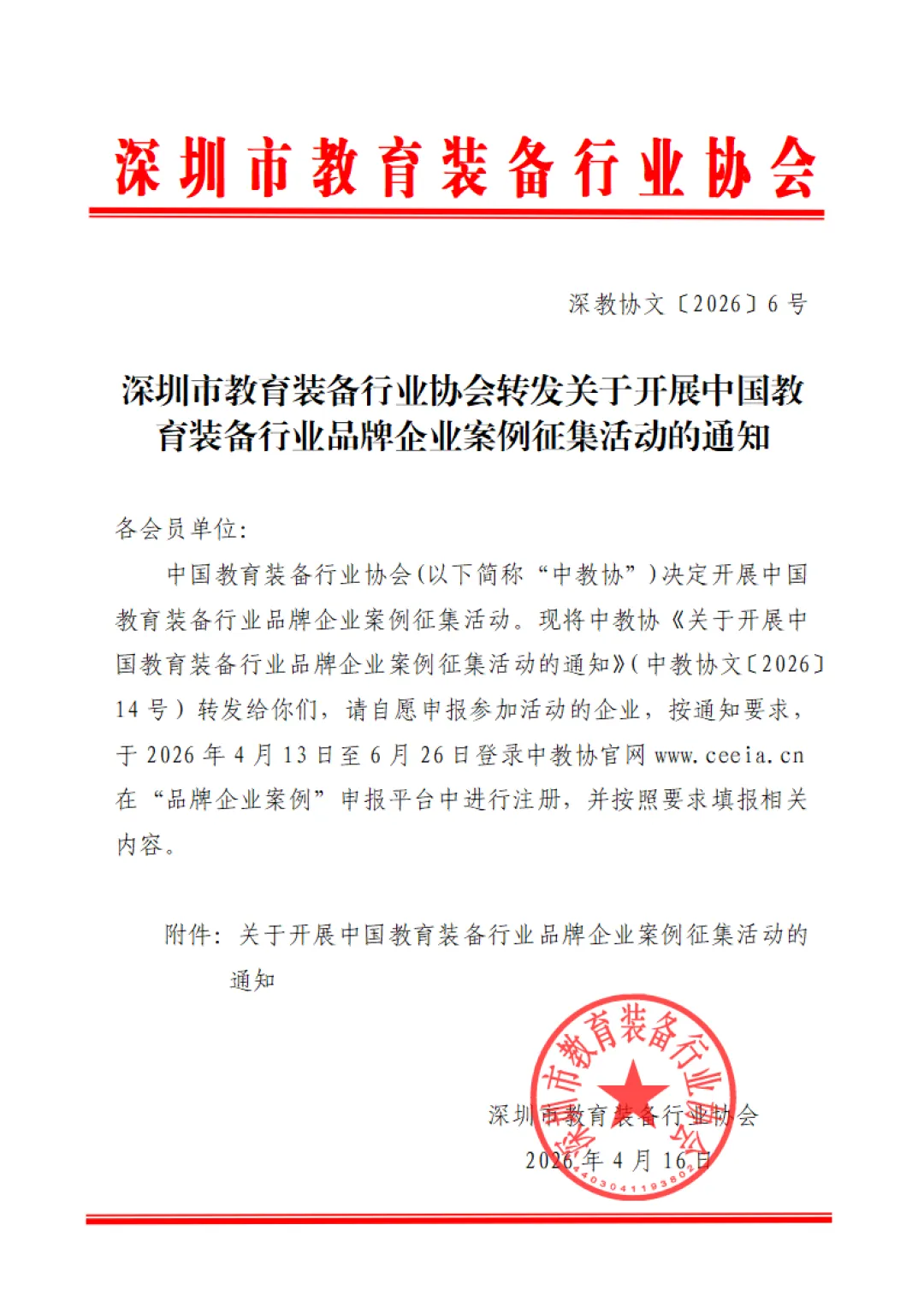 中国教育装备行业协会(以下简称“中教协”)决定开展中国教育装备行业品牌企业案例征集活动。现将中教协《关于开展中国教育装备行业品牌企业案例征集活动的通知》(中教协文〔2026〕14号)转发给你们,请自愿申报参加活动的企业,按通知要求,于2026年4月13日至6月26日登录中教协官网www.ceeia.cn在“品牌企业案例”申报平台中进行注册,并按照要求填报相关内容。