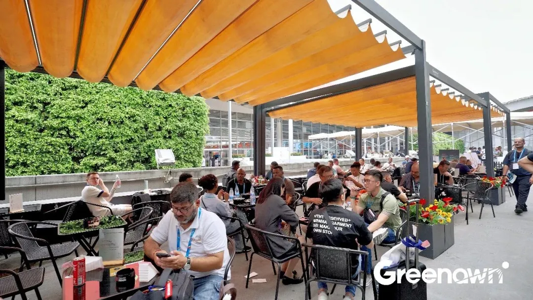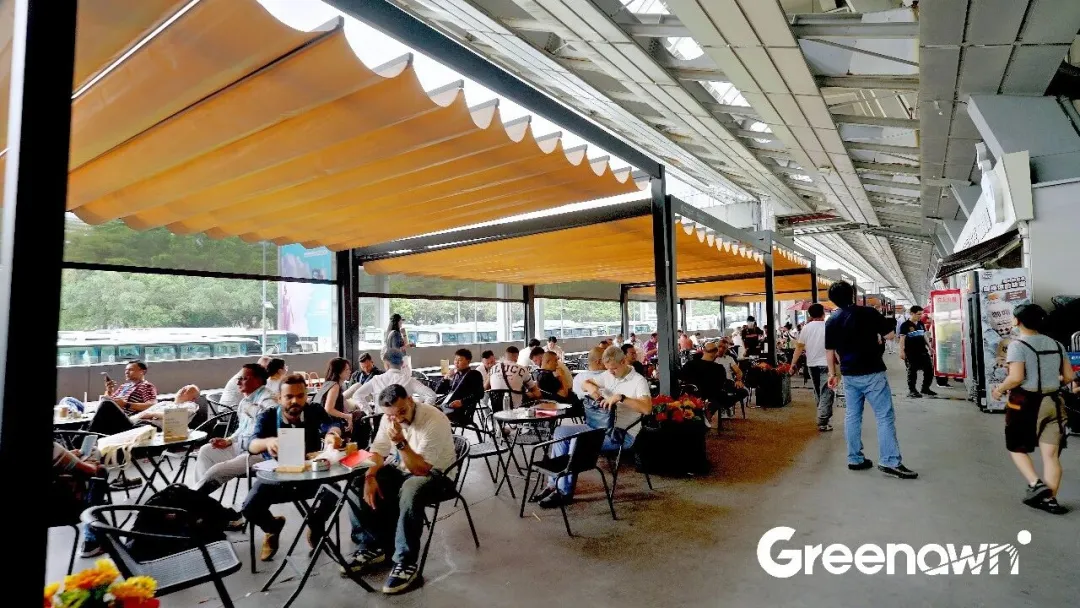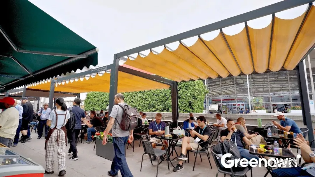 外国客商普遍钟爱室外社交与餐饮氛围。在繁忙的看展、洽谈间隙,格绿朗打造的咖啡外摆休闲区了最受欢迎的“中转站”。波浪篷时尚的流线造型与现代配色,与广交会展馆建筑相得益彰,高低错落的排列更形成一道亮丽的风景线。