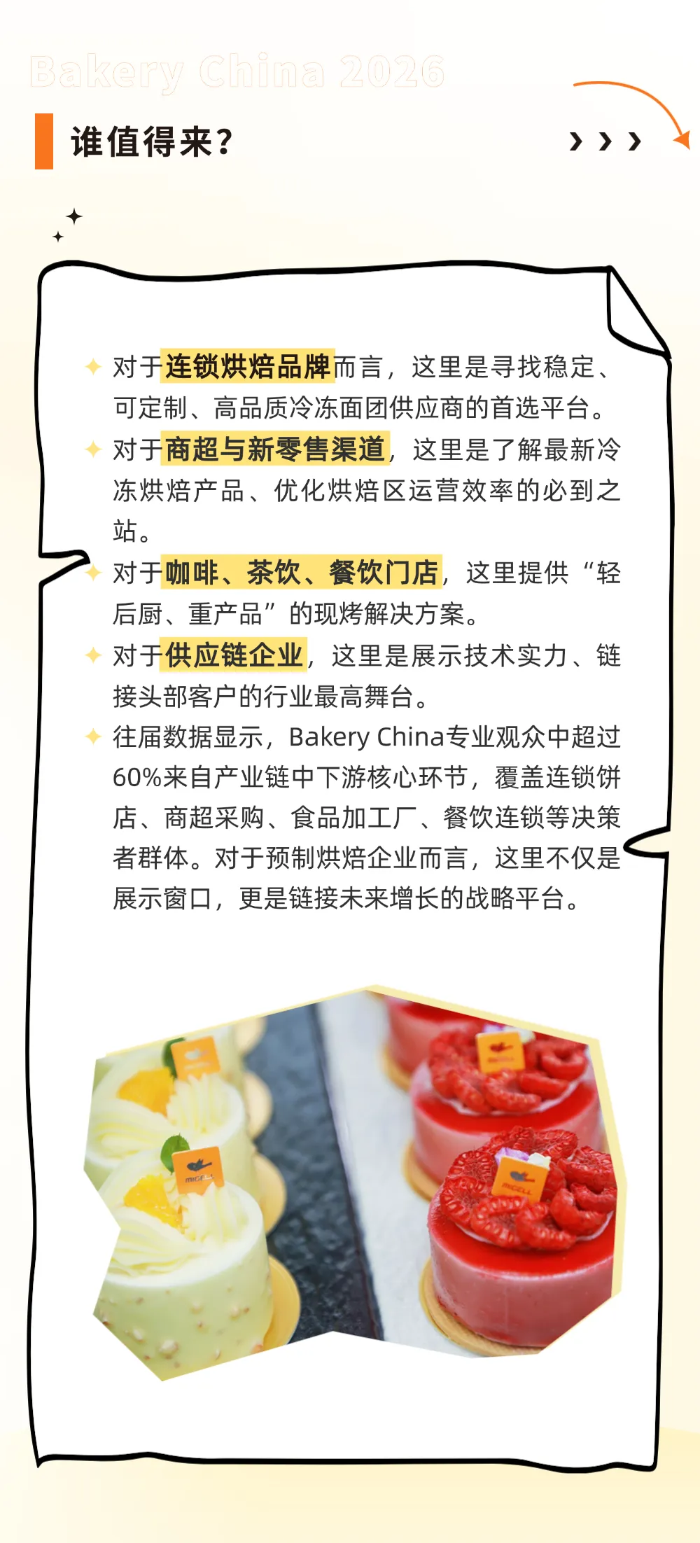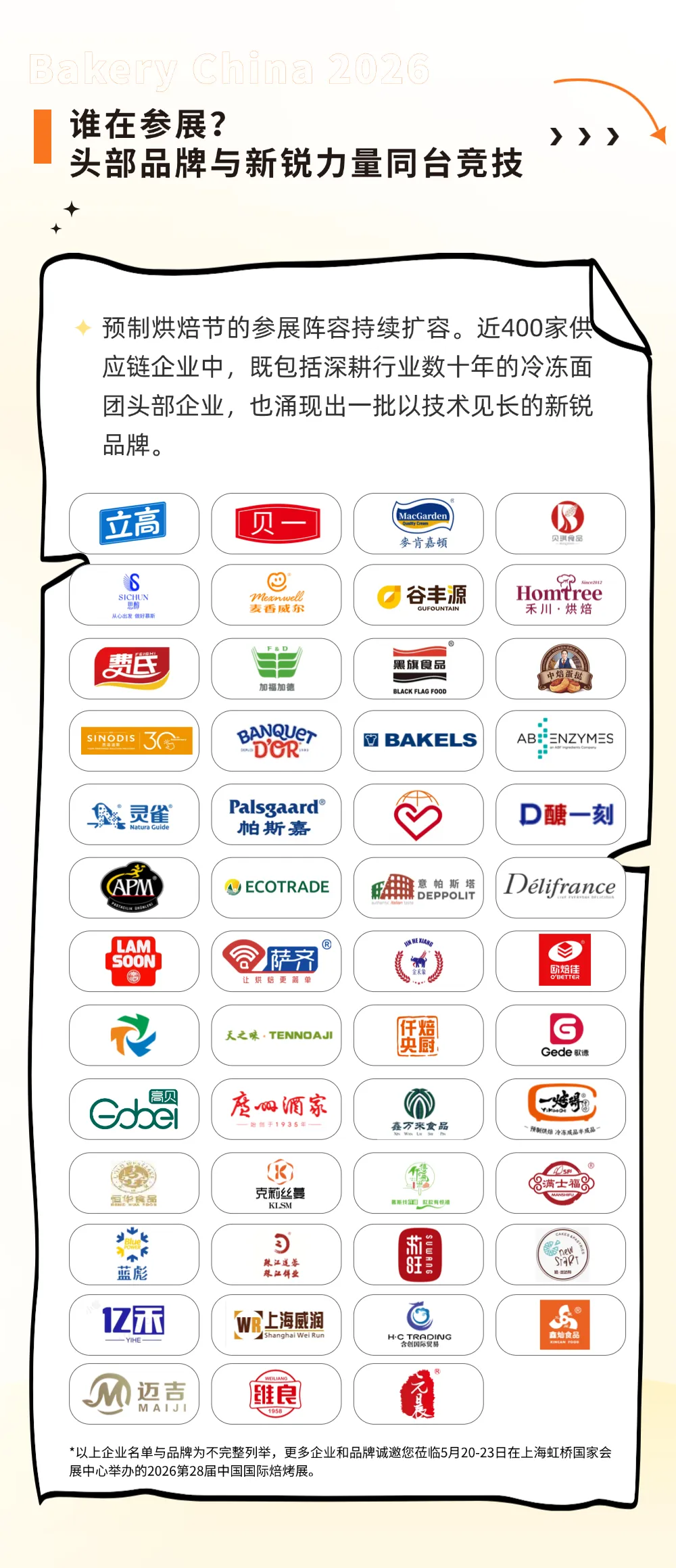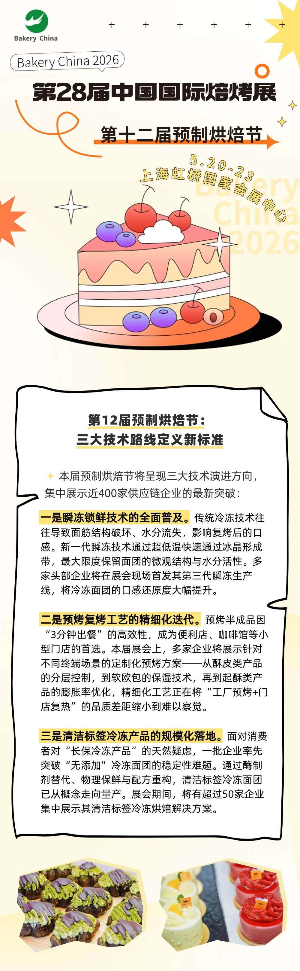 作为全球规模最大的焙烤及相关食品专业展览会,第28届中国国际焙烤展览会(Bakery China 2026)将于2026年5月20-23日在上海虹桥国家会展中心举行。展会重磅推出第12届预制烘焙节,集结近400家国内外头部供应链企业,全景展示从冷冻面团、预烘焙半成品、冷冻成品到配套设备与包装的完整产业链,并集中发布“瞬冻锁鲜”“预烤复热”等年度最新技术成果,为连锁饼店、商超、餐饮及新零售渠道提供一站式解决方案。