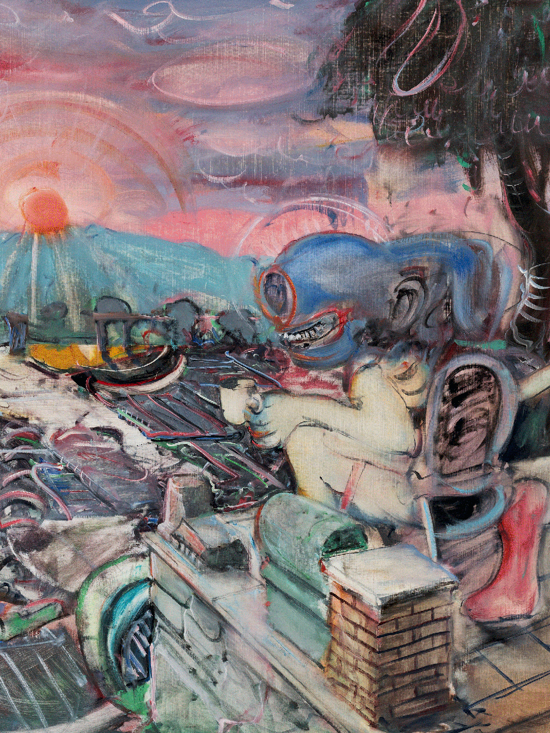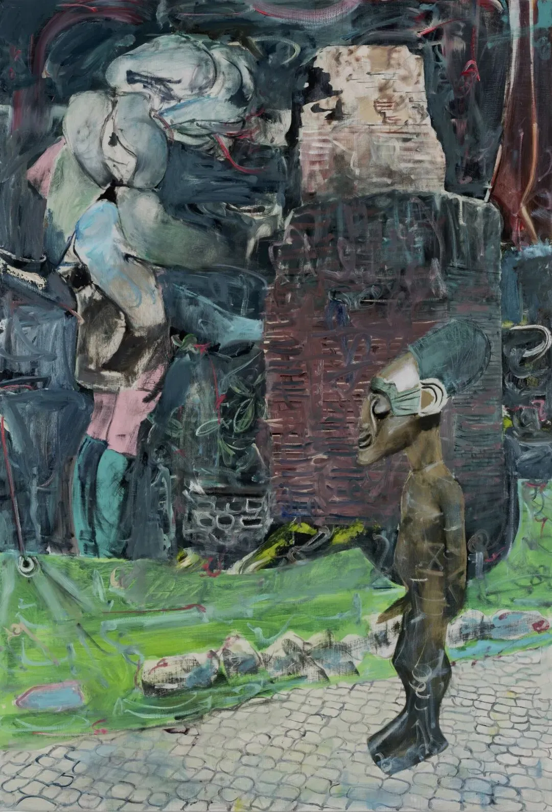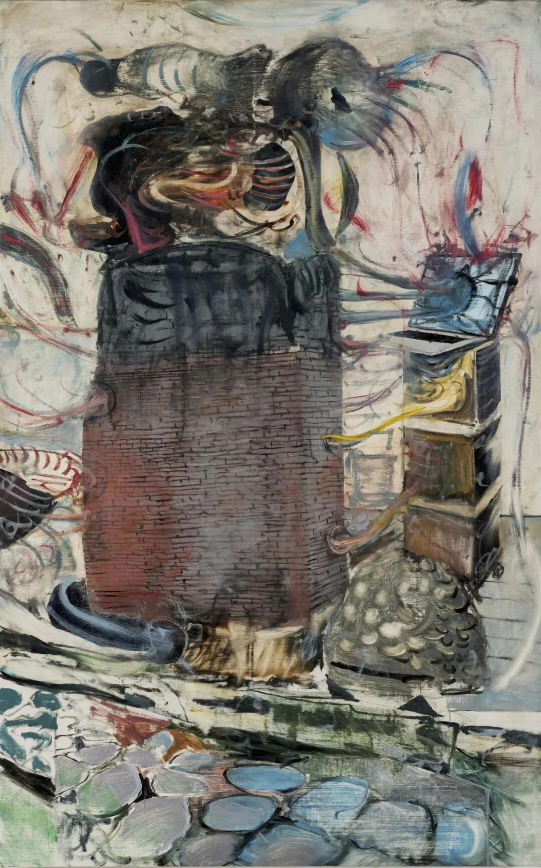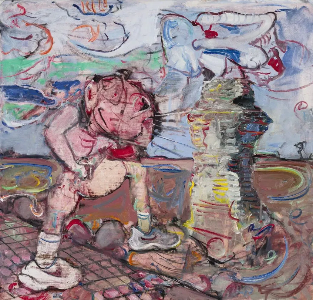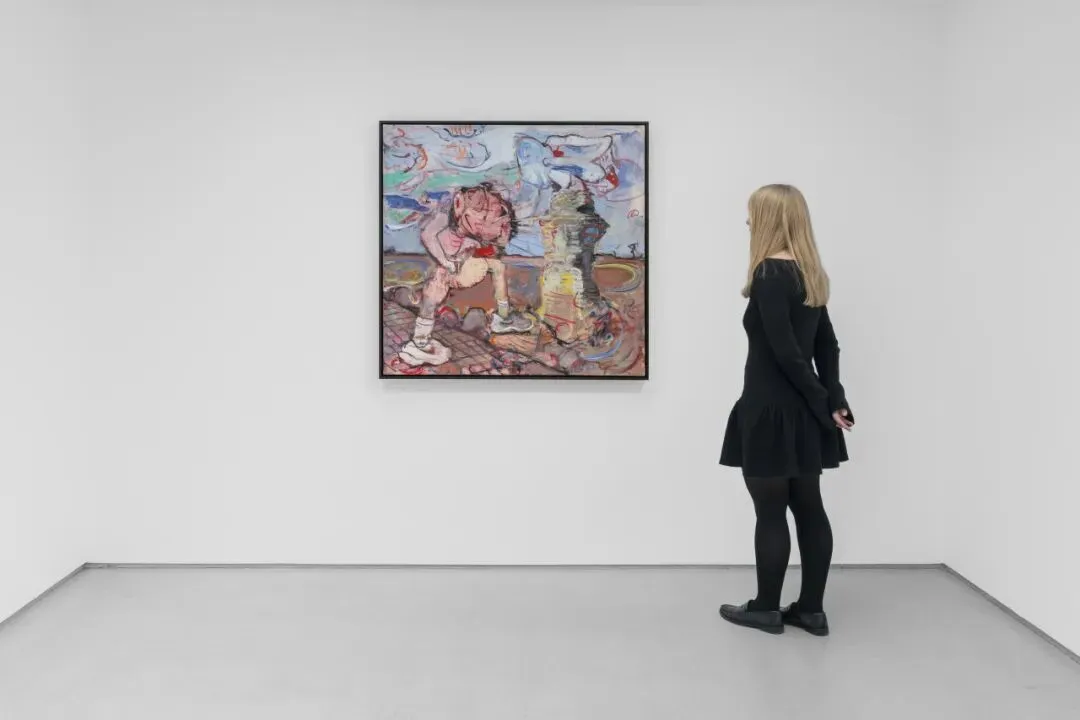对艺术家来说,幽默是一种讨论古代与现代生活之间的冲突的手段。这种方法既挑衅又令人不安,受到了菲利普·加斯顿(Philip Guston)1970–71年在同一地区创作的“罗马”系列的影响:最为明显的是其特有的粉色也出现在了格尼的《罗马田园2》(2026)之中。