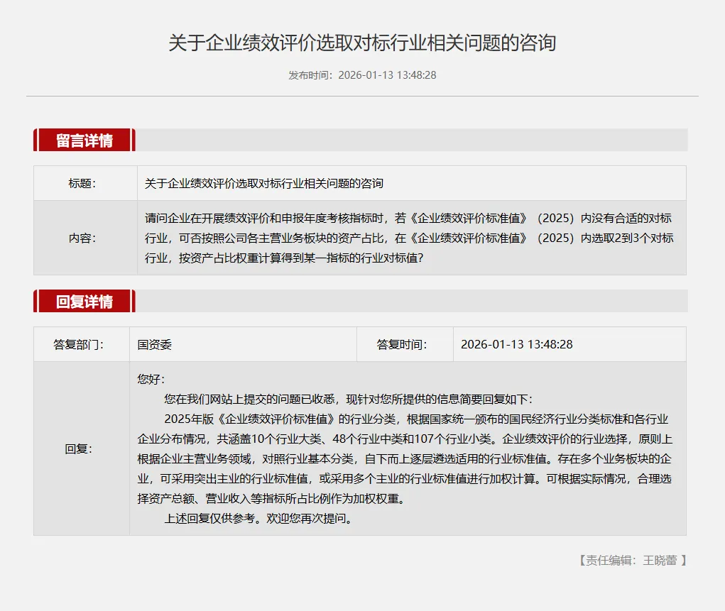 关于企业绩效评价选取对标行业相关问题的咨询:请问企业在开展绩效评价和申报年度考核指标时,若《企业绩效评价标准值》(2025)内没有合适的对标行业,可否按照公司各主营业务板块的资产占比,在《企业绩效评价标准值》(2025)内选取2到3个对标行业,按资产占比权重计算得到某一指标的行业对标值?