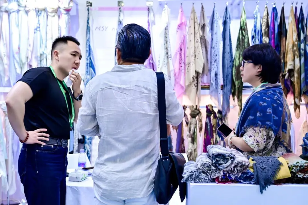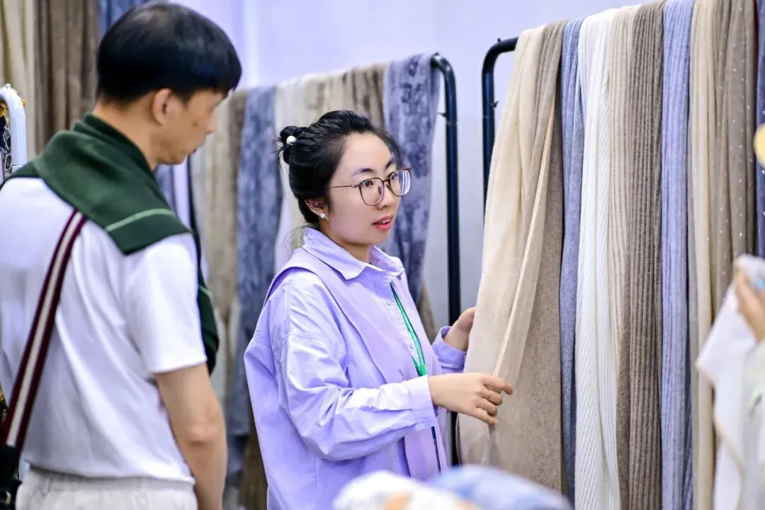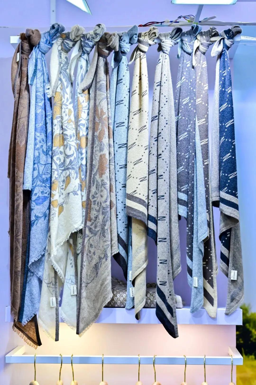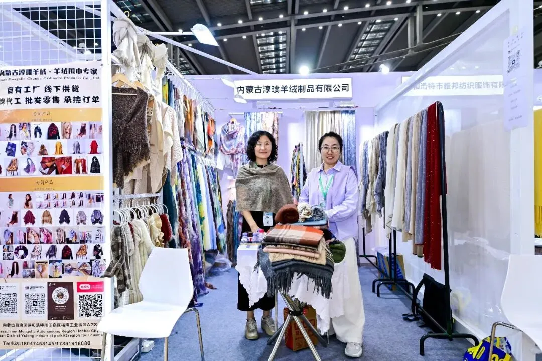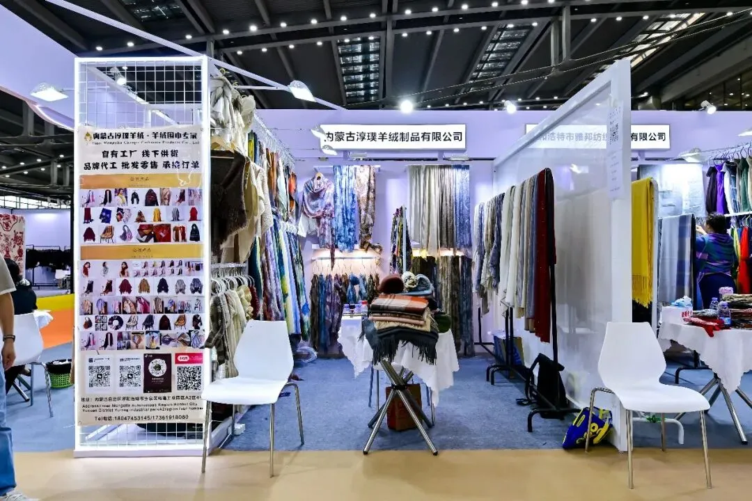 作为 2018 年成立、由大学毕业生团队主导运营的本土羊绒供应链企业,淳璞羊绒深耕呼和浩特本土产业,依托父辈多年行业资源,自建全链路生产体系,拥有自有梭织、针织双工厂,实现原料、染色、纺纱、织布、后整理一体化自主管控。本次展会现场客流稳定,新老客户纷纷莅临展位交流品鉴,深入了解我们的羊绒围巾、羊毛披肩全系列产品,以及现货批发、小单快反、小单定制等灵活合作模式,现场咨询不断、意向客户储备充足,参展效果远超预期。