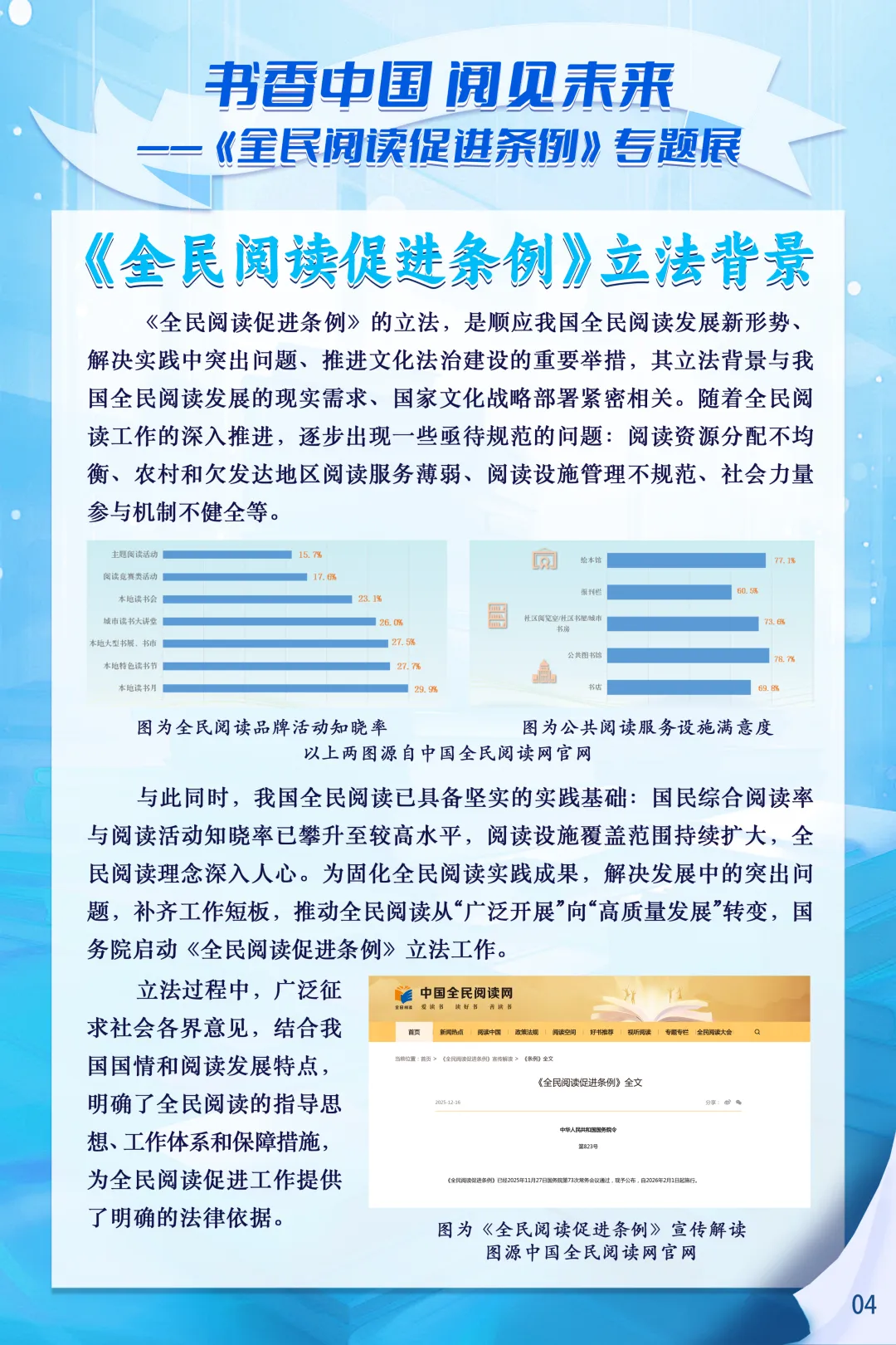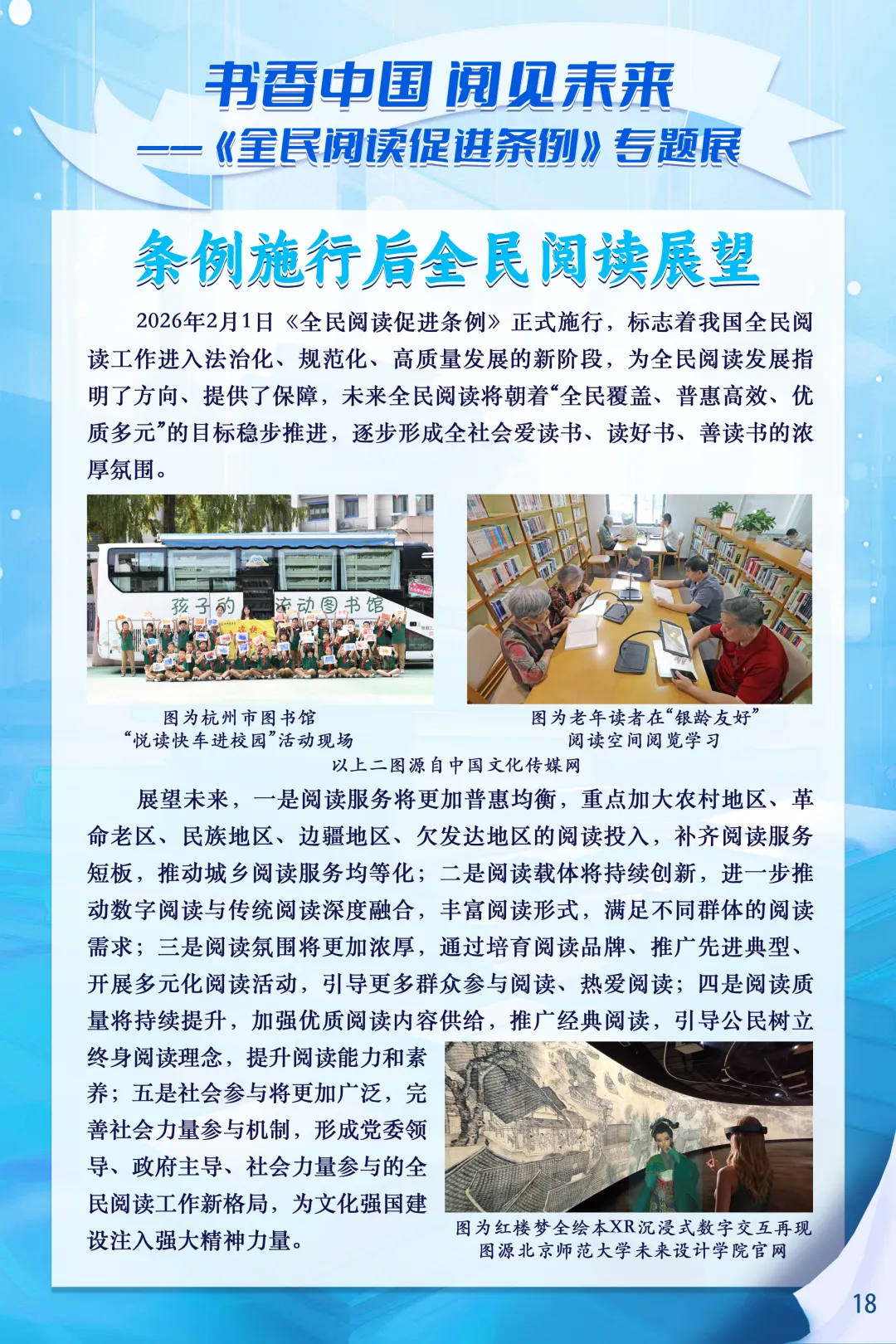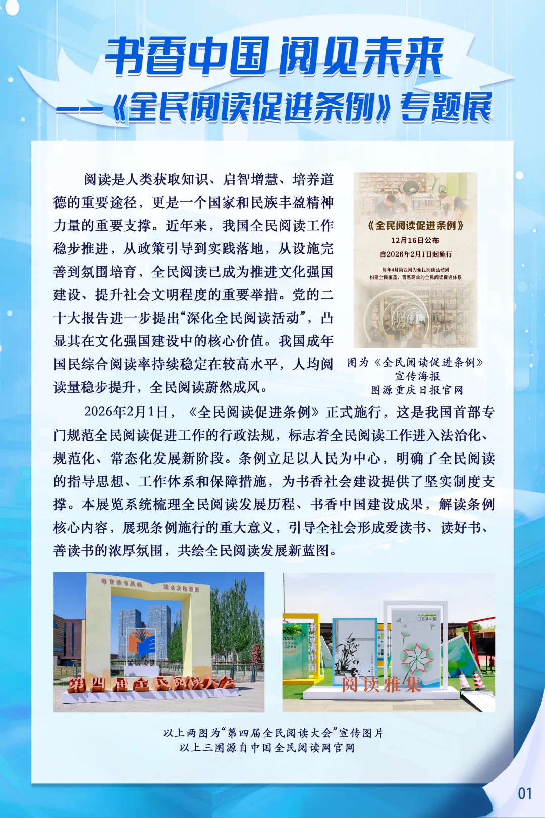 2026年2月1日,《全民阅读促进条例》正式施行,这是我国首部专门规范全民阅读促进工作的行政法规,为书香社会建设筑牢了制度基石。为深入推进书香宁夏建设,全面普及《全民阅读促进条例》相关知识,营造全民爱读书、读好书、善读书的浓厚社会氛围,宁夏图书馆特别推出书香中国-阅见未来—《全民阅读促进条例》专题展,让我们一起感受阅读的力量,见证法治化、规范化、常态化全民阅读新图景,让书香浸润塞上大地。