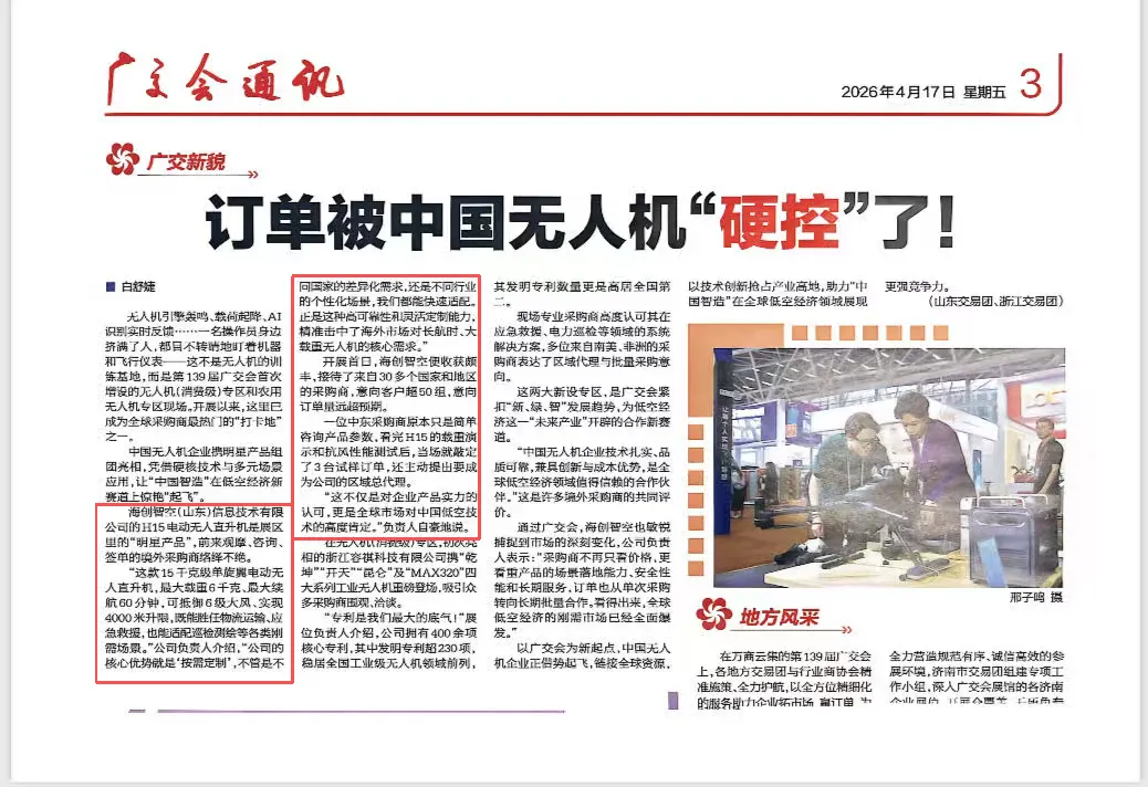 本次参展成果获得权威报纸重点关注,报道中专门提及我司无人机备受外商青睐,成为展会无人机专区的亮眼企业,更是达成签约。