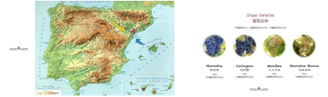 受其多山地形,埃布罗河⾕(特别在南边地区)以及地中海柔和海⻛的影响,圣山产区的气候特征表现为地中海⼤陆性⽓候。葡萄园分布于50⾄700多⽶的海拔⾼度之间,主要坐落在山坡上,坡度为14度⾄32度不等。层峦的⼭脉保护了葡萄藤不受到海洋的影响,在葡萄成熟期间剧烈的昼夜温差便是很明显的体现。昼夜温差帮助提⾼葡萄的多酚⽔平,进⽽酿造出平衡持久的葡萄酒。圣⼭产区全年平均最低⽓温在9℃左右,而平均最⾼⽓温不超过21℃。整体来讲,冬天寒冷,夏季炎热而干燥。年降水量介于400-700升每平方米且不均匀分布,且主要集中在春季及秋季。夏⽇期间,傍晚时分湿润凉爽的海⻛吹往内陆,带来炎热干燥⽉份葡萄所急需的额外⽔分,也促成了葡萄均匀缓慢的成熟周期,增强其天然清新酸度。圣⼭产区这种得天独厚的地理及地形条件,造就了⽆数的⼩型⽓候带,因此也赋予了每⼀⼩块葡萄园独一无二的个性及品质。这就是为什么圣山产区能够⽣产如此多样独特且与众不同的优质葡萄酒。