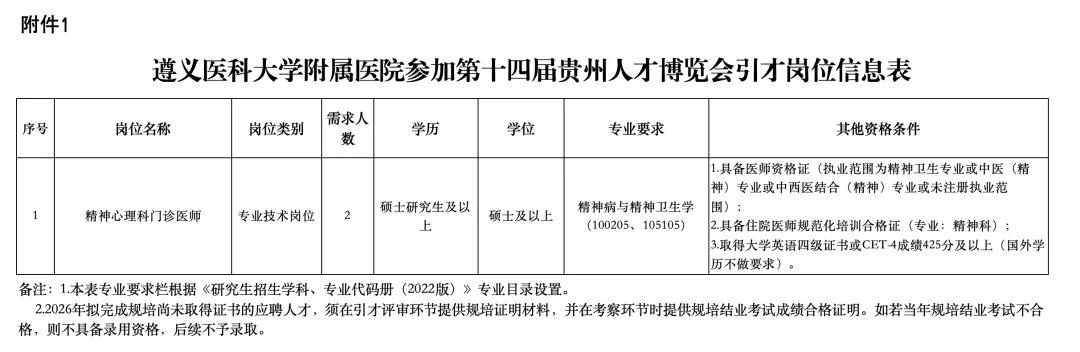 遵义医科大学附属医院是国家卫生健康委员会与贵州省人民政府共建高校的直属附属医院,前身是大连医学院附属医院,1969年为支援三线建设举院南迁,系贵州省首家三级甲等综合医院,是国家疑难病症诊治能力提升工程(恶性肿瘤早期诊断与精准治疗方向)建设单位。根据《省人力资源社会保障厅关于做好第十四届贵州人才博览会事业单位引进人才工作的通知》(黔人社通〔2026〕16号)文件精神,为做好我院第十四届贵州人才博览会引才工作,特制定本方案。(二)坚持德才兼备、以德为先、五湖四海、任人唯贤的原则。(三)坚持按需设岗、按岗招聘、人岗相适、人事相宜的原则。根据工作需要,拟引进专业技术人员2名,具体引才岗位及要求见《遵义医科大学附属医院参加第十四届贵州人才博览会引才岗位信息表》(附件1)。1.具有中华人民共和国国籍,拥护中华人民共和国宪法,拥护中国共产党领导,遵纪守法,具有良好的思想政治素质。2.自觉遵规守纪,诚实守信,品行端正,具有良好的职业道德和敬业精神。3.专业素养好,熟悉有关政策法规和行业发展情况,具有胜任应聘岗位需要的相关专业知识和工作能力。5.年龄在18周岁以上(2008年4月21日以前出生),硕士研究生年龄在45周岁以下(1980年4月29日以后出生)。以上日期均含当日。6.符合应聘岗位要求的其他具体资格和条件(附件1)。尚在试用期或服务期内的省内事业单位在编工作人员,不列入本次引才对象范围;通过人才“绿色通道”政策引进到事业单位的在编工作人员,在省内流动的,不得重复享受“绿色通道”引才政策支持。在贵州省人力资源和社会保障厅官网及遵义医科大学附属医院官网发布引才工作方案。公告时间2026年4月21日至2026年4月29日。2026年4月21日至2026年4月29日18时。应聘人员应在4月29日18时前登录贵州人才博览会官网(http://rc.guizhou.gov.cn/)注册个人信息,在贵州人才博览会官网向用人单位投递求职简历及相关材料。应聘岗位所需佐证材料扫描后制作成1个PDF文件作为附件发送至zyfyzzrsc@163.com(邮件命名为:贵州省第十四届人博会 + 岗位名称+姓名)。应聘人员根据所报岗位要求,如实、准确、完整地填写报名信息,认真核对信息后及时提交。(2)本人有效《居民身份证》(需提供证件正反两面图片)、毕业证书、学位证书。2026年度毕业生须提供填写完整并加盖学校公章的毕业生就业推荐表,但在考察环节时(截止2026年12月31日),必须按要求提供相应的毕业证书、学位证书原件及复印件1份。国(境)外学历须提供教育部留学服务中心出具的“国外学历学位认证书”或“香港、澳门特别行政区学历学位认证书” 或“台湾地区学历学位认证书”;(3)报考要求取得大学英语四级证书或CET-4成绩425分及以上的岗位,须提供大学英语四级或六级合格证,CET-4或CET-6成绩单(分数在425分及以上)。(4)报考要求具备医师资格证、住院医师规范化培训合格证的岗位,须提供医师资格证、医师执业证、住院医师规范化培训合格证。2026年拟完成规培尚未取得证书的应聘人员,须提供规培证明材料,并在考察环节时提供规培结业考试成绩合格证明。截止2026年12月31日前未取得规培证书,则不具备录用资格,后续不予录取。提交的报名材料应当真实、准确、完整。应聘人员因身份证过期、信息填写失误、未按时提交报名材料等原因,导致网上资格审核未通过或后续考试过程中出现无法通过资格审查等问题的,后果由应聘人员本人承担。(1)应聘人员填报的专业名称必须与毕业证和学位证完全一致,如专业名称后面带括号或其他说明的也必须如实填报。(2)辅修专业不能作为《遵义医科大学附属医院参加第十四届贵州人才博览会引才岗位信息表》中“专业”报名;须以最高学历学位报考。(3)留学归国、高校自设学科等应聘人员所学学科专业与资格条件要求的学科专业相近但不在选定参考目录,且所学专业课程、研究方向与岗位所需专业相近率达到70%,可纳入报考范围;岗位专业要求为二级学科的,对该二级学科专业所属一级学科,且专业相同率达到70%以上的,可纳入报考范围。符合本条款规定的应聘人员,提供本人亲笔签字按手印的《提交专业比对条件报考人员承诺书》(附件2)发送至zyfyzzrsc@163.com(邮件命名为:贵州省第十四届人博会+岗位名称+姓名)。资格复审环节由应聘人员本人如实提供比对专业名称及课程的有效证明材料,我院将根据应聘人员提供的证明材料组织专家结合岗位专业要求开展论证。不如实提供有效证明材料的责任由应聘人员本人承担。我院将根据专家论证结果进行资格复审,若专家论证结果为达不到本条款要求的,不得进入下一环节。原则上要求本人亲自报名和填写相关信息,信息填写不真实、不完整或填写错误的责任自负。如因特殊情况请他人代为填写报名信息的,视为应聘人员本人填写,由应聘人员本人承担相关责任。若网上填写信息不真实、不完整或填写错误的责任自负。应聘人员提交报名申请后应及时登录查看网上审核结果。应聘人员应认真核对是否符合所选岗位要求的资格条件,事业单位、国有企业在职在岗人员必须如实填写个人工作单位信息,否则视为故意隐瞒个人重要信息。应聘人员故意隐瞒本人重要信息或提供虚假报考申请材料的,一经查实,立即取消进入下一个环节的资格。我院按照岗位信息审查