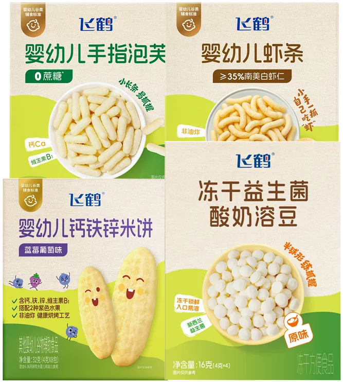 ● 细腻易溶、软糯好吞咽,锻炼抓握咀嚼,助力宝宝自主进食。