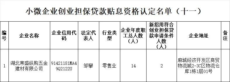 为进一步优化营商环境,持续释放创业带动就业的倍增效应,切实解决小微企业“融资难、融资贵”问题,根据国家统计局关于印发《统计上大中小微型企业划分办法(2017)的通知》(国统字〔2017〕213号)、财政部《普惠金融发展专项资金管理办法》(财金〔2023〕75号)及省财政厅《关于明确创业担保贷款财政贴息有关政策标准的通知》(鄂财金发〔2023〕34号),现对2026年度第十一批小微企业创业担保贷款贴息资格认定已审核通过的1家企业名单进行公示。如发现有企业不符合相关政策规定,请向麻城市劳动就业服务中心反映,经认定公示不存在异议的小微企业名单将提交至下一步流程审核。
