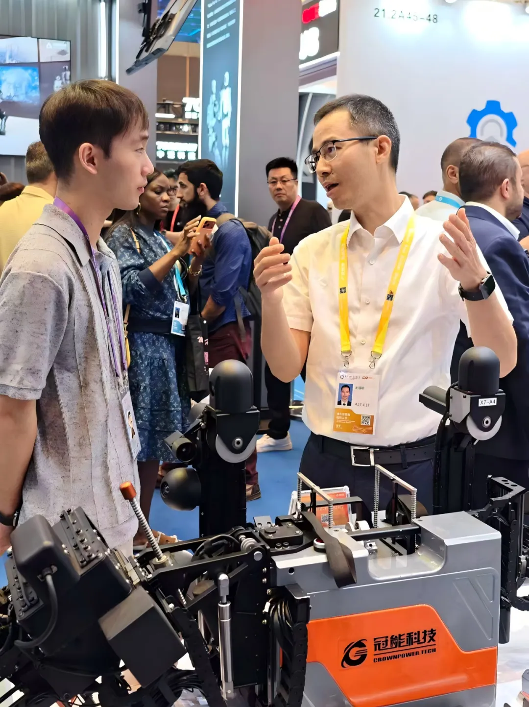 在D区电子消费品及信息产品展区,广东冠能电力科技发展有限公司(以下简称“冠能科技”)的智能带电作业机器人阵列引人注目。据介绍,冠能科技展出的智能碾压式除冰机器人具备超强续航、不停电作业、全地形适应、高效除冰四大“超能力”,将传统人工除冰半天的工作量压缩至十几分钟。