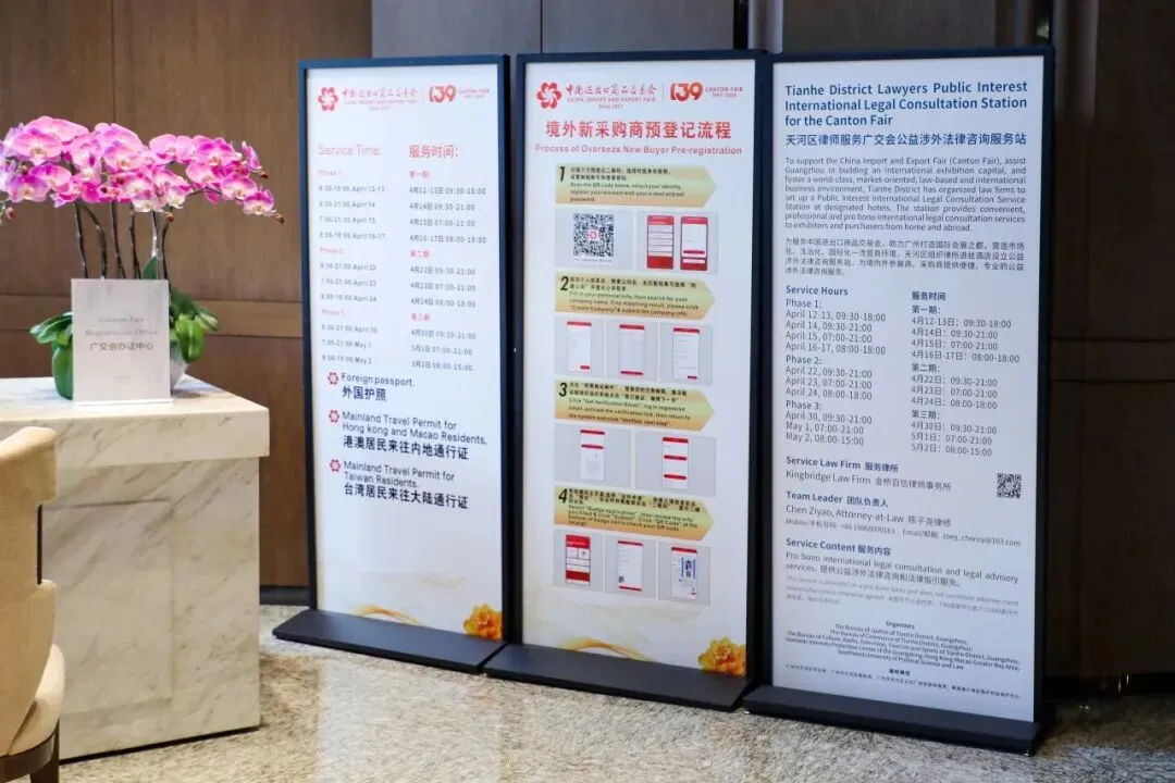 第139届中国进出口商品交易会(广交会)于4月15日在广州开幕,为充分发挥天河区涉外法律服务资源集聚优势,天河区司法局联合区商务局、区文化广电旅游体育局、粤港澳大湾区海外利益保护中心,创新推出“展会赋能+酒店驻点+律师护航”服务模式,选派优质律师事务所进驻位于珠江新城核心区的酒店,设立“天河区律师服务广交会公益涉外法律咨询服务站”(以下简称“公益涉外法律咨询服务站”)。