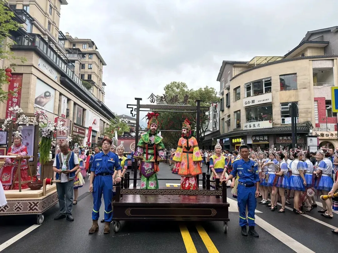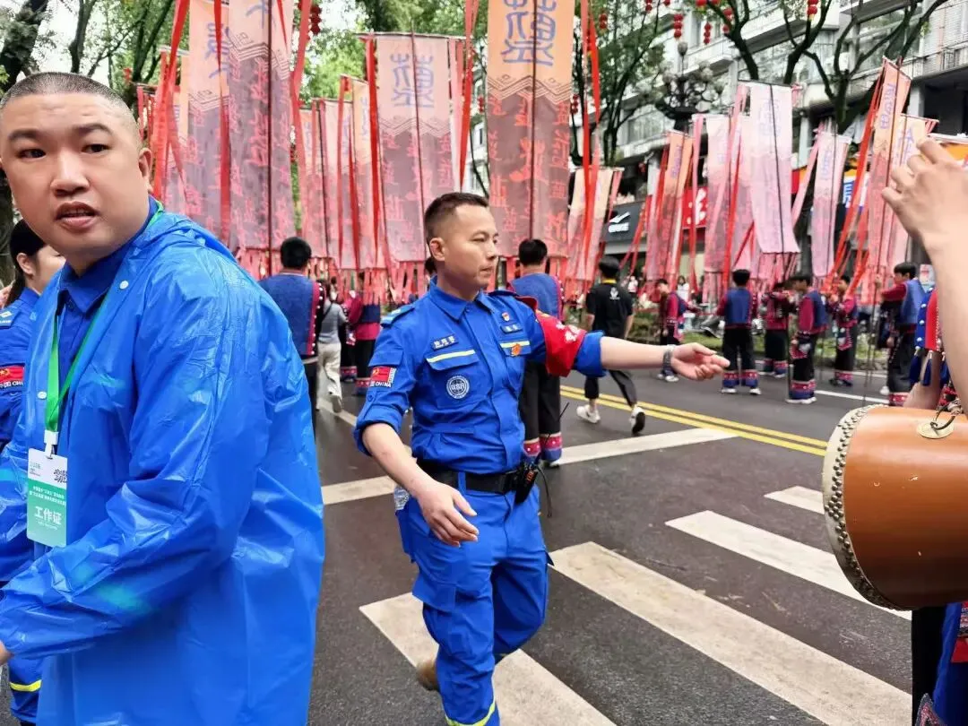 本届"三月三"活动期间,"公主巡游"民俗风情沉浸式展演成为最吸睛的亮点。从响鼓迎宾、鼓舞凤鸣,到同心纳福、公主承焰、篝火燎原,整个活动庄重而热烈。景宁蓝天救援队积极响应志愿服务号召,主动融入巡游队伍,队员们与身着畲族盛装的群众携手同行,在欢声笑语中共庆佳节。在巡游路线沿途,救援队队员有序引导观众分流,实时观察人流密度,及时疏导拥堵点位,确保数万名观众安全、有序观赏巡游盛况。每一位队员既用饱满的热情融入到畲乡狂欢的喜庆氛围中,更用专业的素养守护着现场的每一份安全。