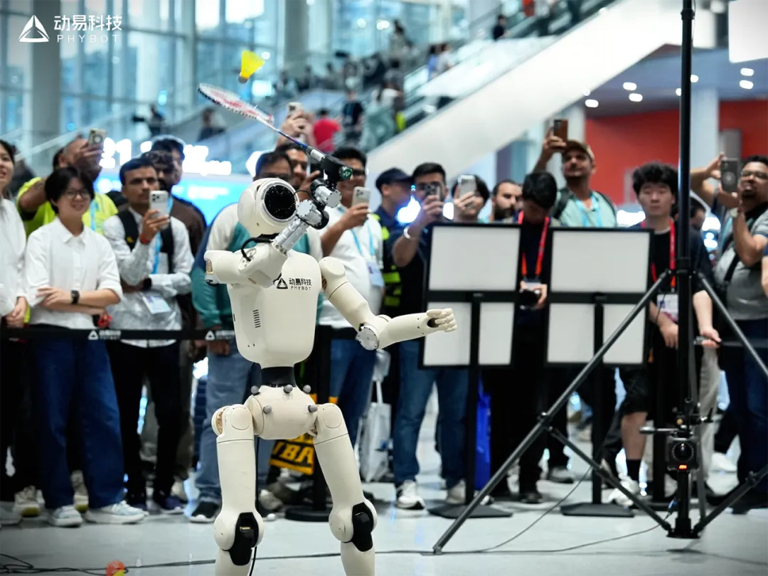 在广州动易人工智能科技有限公司展区,一台身高仅1.35米的人形机器人格外吸睛,只见它灵活挥动球拍,精准接住并回击观众发出的羽毛球,动作流畅、反应迅捷,引得现场观众连连赞叹。