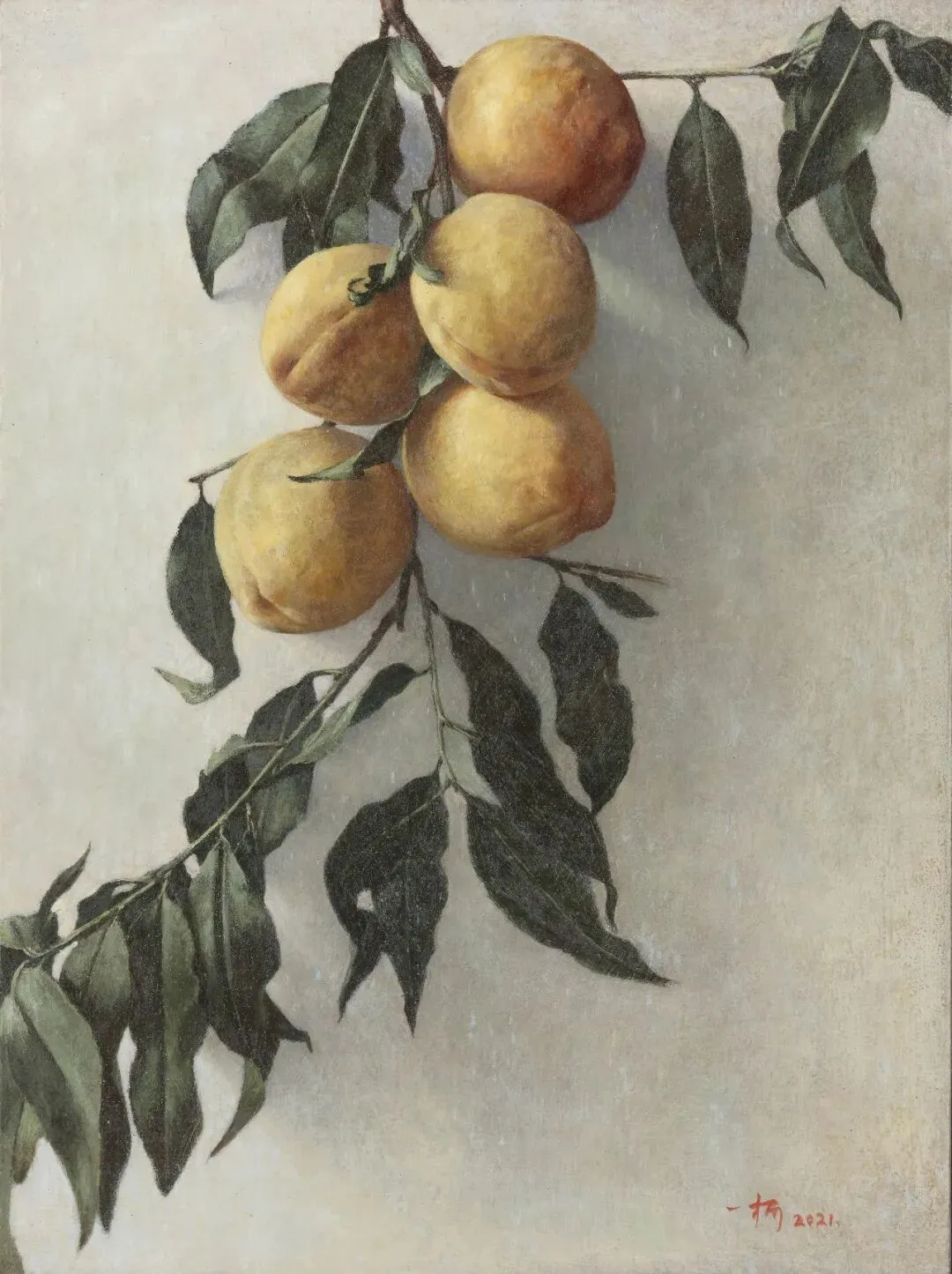 曹一柯 《一串桃子》之一 木板油画 41cmx31cm 2021年