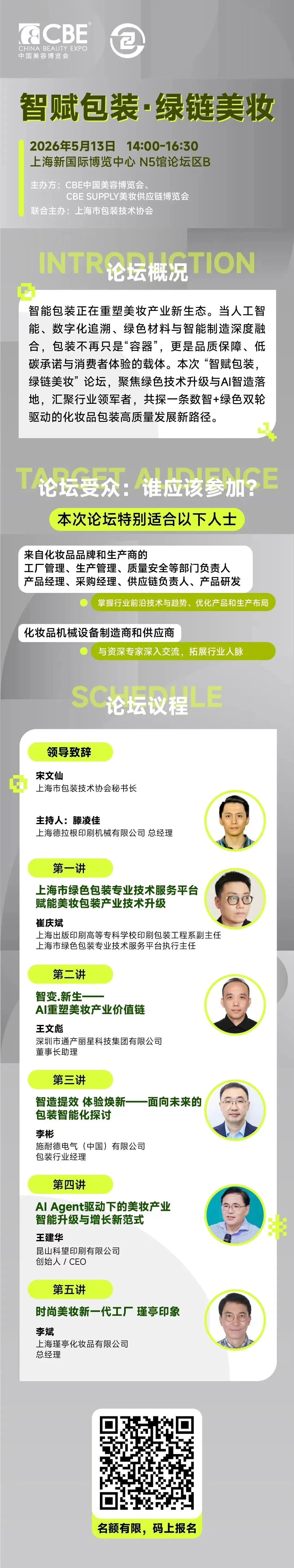 【展会资讯】5月13日下午2:00,上海新国际博览中心N5馆论坛区B——“智赋包装 绿链美妆”硬核开讲 不见不散