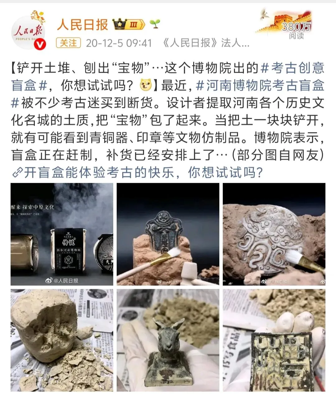 12月1日,一位广东银行职员在河南博物院购买该产品后,在豆瓣分享开盒体验,产品开始在小范围内积累声量。几乎同时,习近平总书记在《求是》杂志发表“让收藏在博物馆里的文物、陈列在广阔大地上的遗产、书写在古籍里的文字都活起来,丰富全社会历史文化滋养。”的重要论述,全国文旅系统迅速响应,寻找“让文物活起来”的典型案例。12月5日,人民日报微博点名推荐,央地媒体密集跟进,考古盲盒一夜爆火,日销峰值达2000单,成为故宫之后首个现象级非头部博物馆文创。