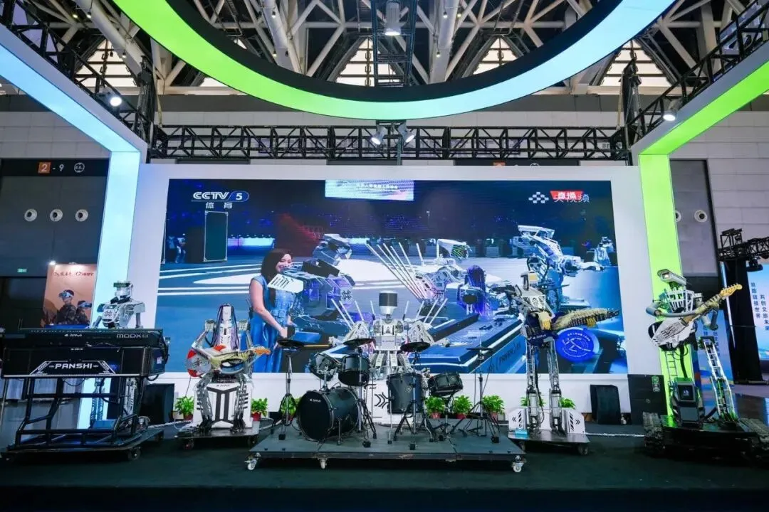 在磐石科技展台,一支由机器人组成的乐队正在激情“开演”,不少观众纷纷拿起手机、相机拍照打卡。一位身着红色夹克的游客感叹道:“现在的机器人真是越来越厉害了,看看这表演氛围感拉满,一点都不输真人演出。”