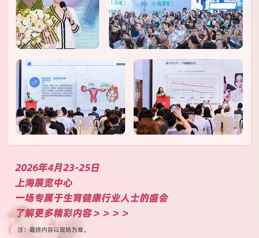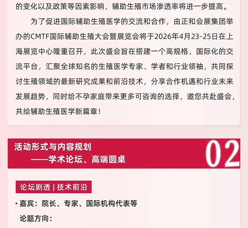 为了促进国际辅助生殖医学的交流和合作,由正和会展集团举办的CMTF国际辅助生殖大会暨展览会将于2026年4月23-25日在上海展览中心隆重召开,此次盛会旨在搭建一个高规格、国际化的交流平台,汇聚全球知名的生殖医学专家、学者和行业领袖,共同探讨生殖领域的最新研究成果和前沿技术,分享合作机遇和行业未来发展趋势,同时给不孕家庭带来更多可咨询的选择,邀您共赴盛会,共绘辅助生殖医学新篇章!