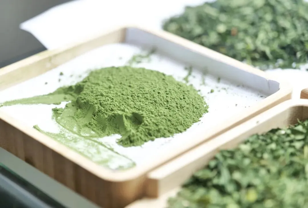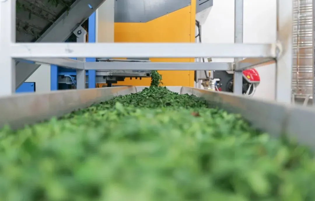 雨城区首条欧标碾茶生产线正式开机。鲜叶从进料口投入,沿着传送带向前走——切茶、筛老叶、去渣、冷却、杀青、风干锁香、梗叶分离、烘干、风选,一道工序紧挨着一道。一个半小时后,第一批碾茶成品从出料口落下来,还带着余温。