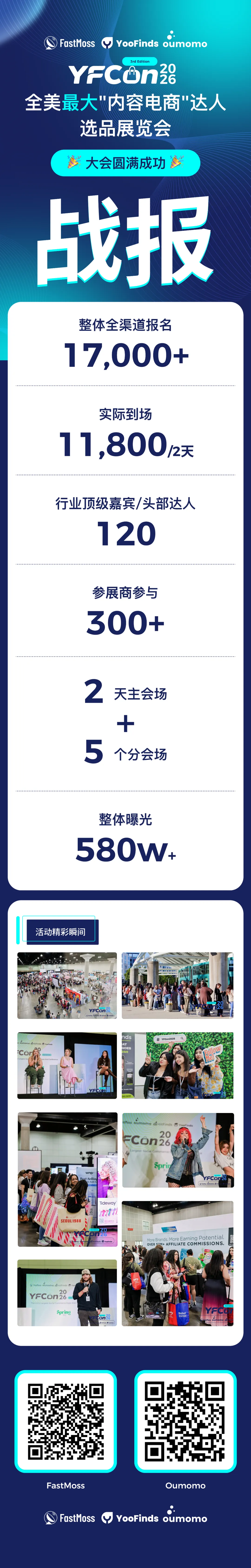 感谢11,800+位从全球各地到来的参会者,你们的参与让这场春季盛会具备真实的行业意义;感谢120+位头部达人与嘉宾,带来高密度的实战分享;感谢300+参展品牌与机构的深度参与,共同构建了一个高效的选品与合作场景;也感谢所有团队成员的持续投入,让这场活动顺利落地。从去年秋季到今年春季,YFCon持续验证了一件事:内容电商正在进入一个更高效率的阶段——从单点爆发,走向系统化增长。本次春季选品展不仅为2026年跨境电商春季营销拉开序幕,也进一步强化了一个长期存在的趋势:线下连接,正在成为线上生意的重要放大器。
