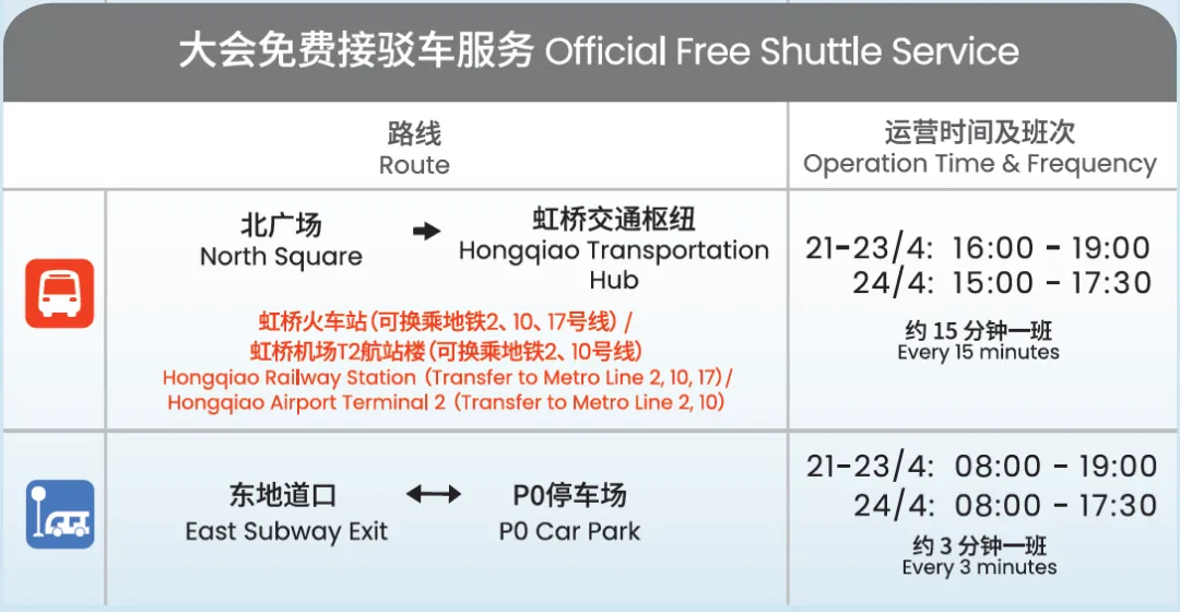 在展馆东侧的东地道口设有大会免费接驳车,带您往返东地道⇋P0停车场。