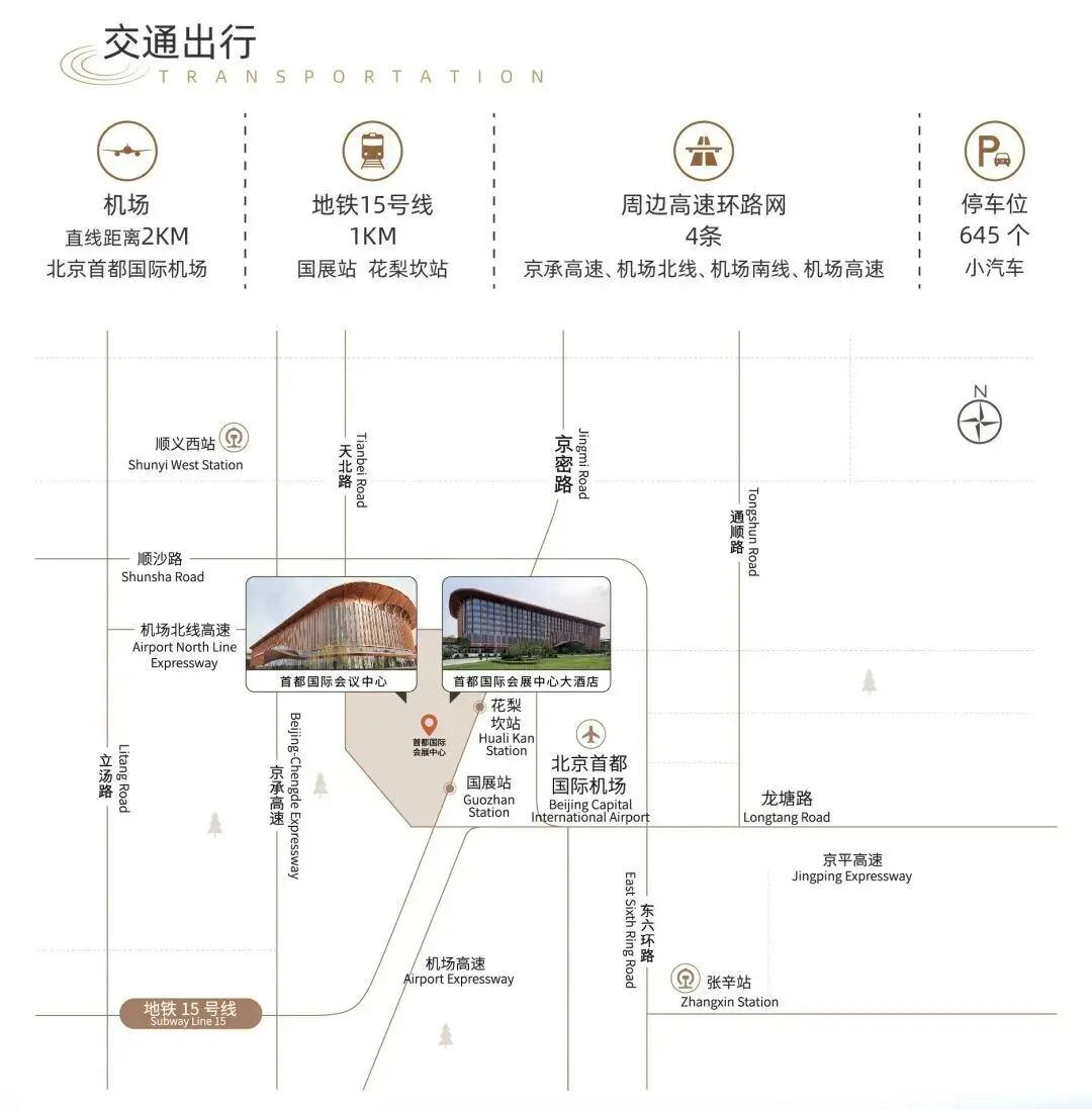 场馆周边交通:距离天安门直线24公里,首都国际机场直线2公里,地铁15号线;2个地铁站:花梨坎站和国展站;周边4条高速形成环路网,京承高速,机场北线,机场南线,机场高速。
