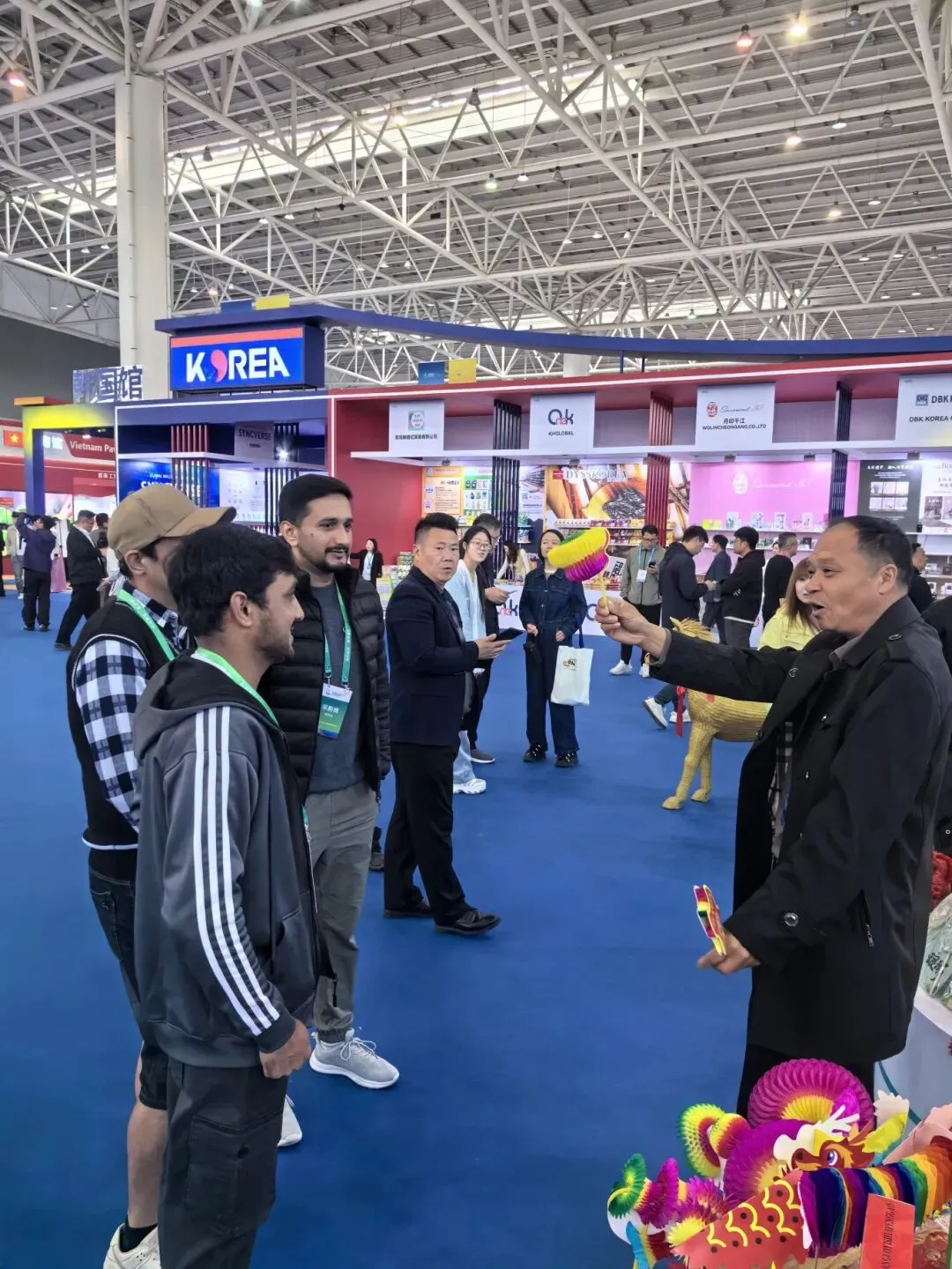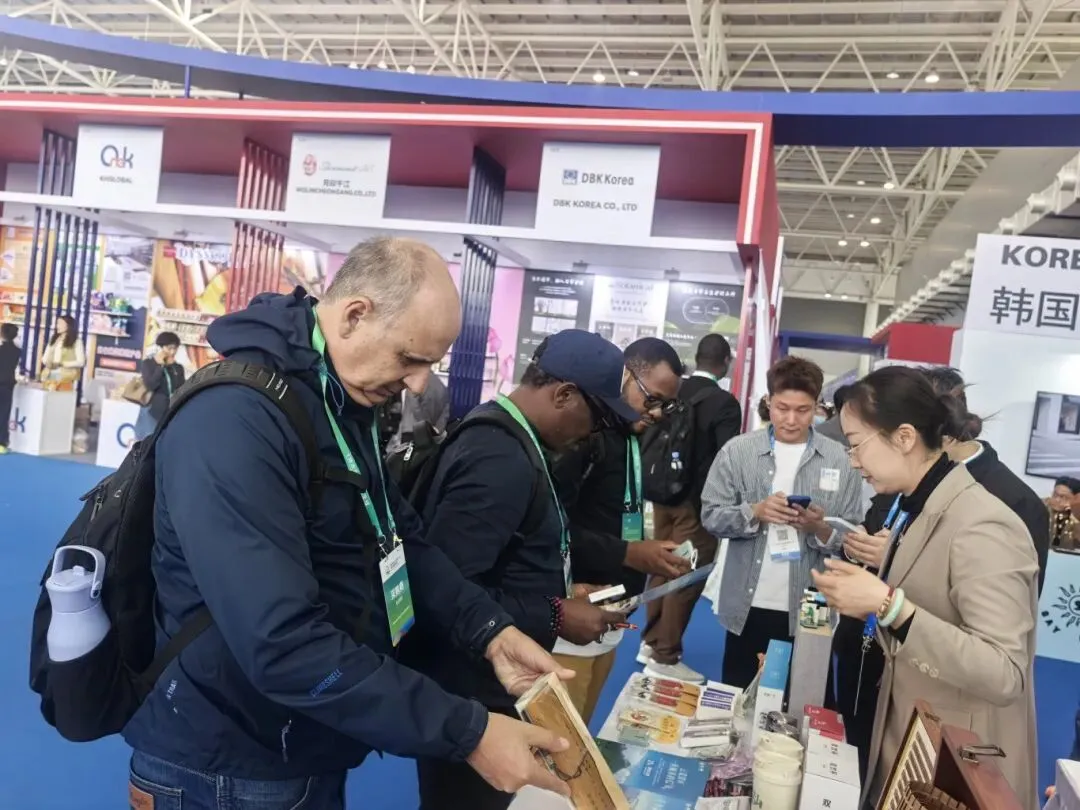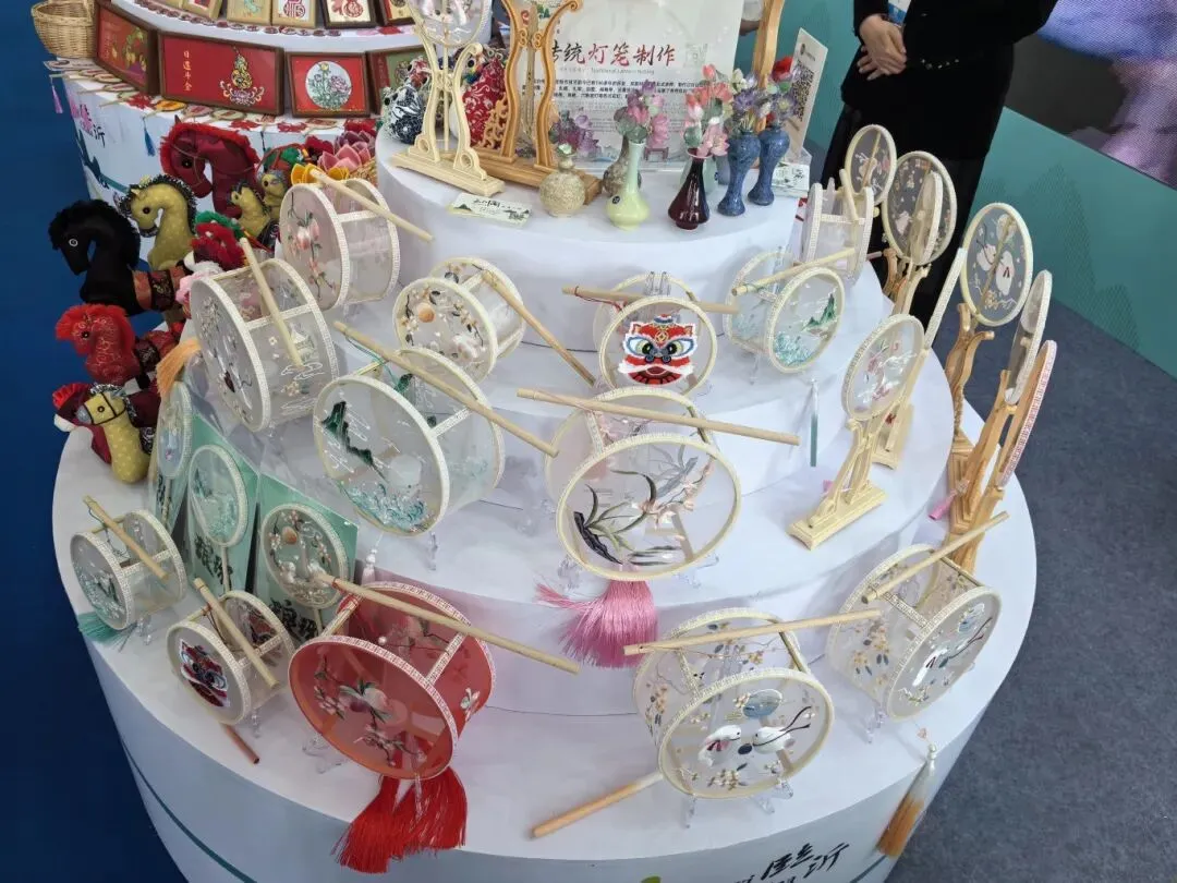 非遗互动区是展厅的“流量担当”。临沭柳编、沂蒙布艺、刘氏翻花、沂蒙剪纸、沂水丰糕、传统灯笼制作应有尽有……非遗传承人现场亮绝活,刘氏翻花传承人手一抖,纸花瞬间变出三四种形态,引得国际客商连连比划“再来一次”。最受欢迎的是沂水丰糕的免费品尝区,“甜而不腻,有米香!”试吃者排起小长队。文创展区摆满了临沂市博物馆、临沂文旅集团带来的特色文创:竹简兵法书签、胡人骑狮文创、灯火兰山新琅琊帆布包……来自水韵琅琊的演员们穿上汉服,现场还跳起了欢快的舞蹈,引得现场观众纷纷围观赞叹。