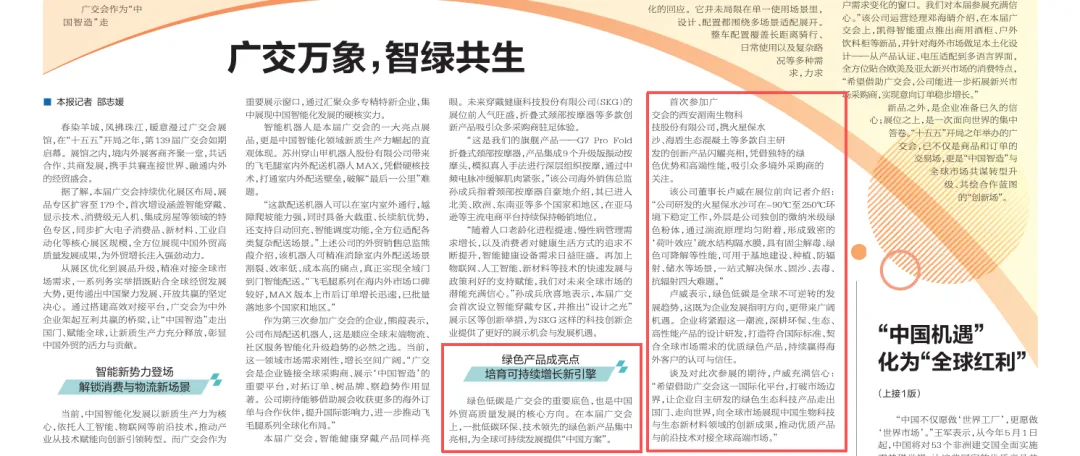 近日,第139届中国进出口商品交易会在万众瞩目中盛大启幕,这场汇聚全球商机与智慧的经贸盛会,吸引了众多国内外企业竞相参与。西安湄南生物科技股份有限公司(以下简称“湄南高科”)作为绿色生态复合新材料领域的创新领袖,携全系列产品重磅亮相,成为展会上一颗耀眼的明星,不仅吸引了全球客商纷纷驻足洽谈,更引得央视新闻、人民日报、新华网、环球网、中国日报、商务部等多家媒体现场报道,CCTV1、CCTV13现场进行专题直播报道。