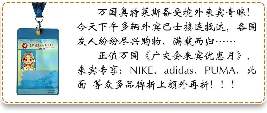 众多外国来宾前来万国购物!《广交会来宾优惠月》来宾专享:NIKE、adidas、PUMA、北面 等众多品牌折上额外再折!!