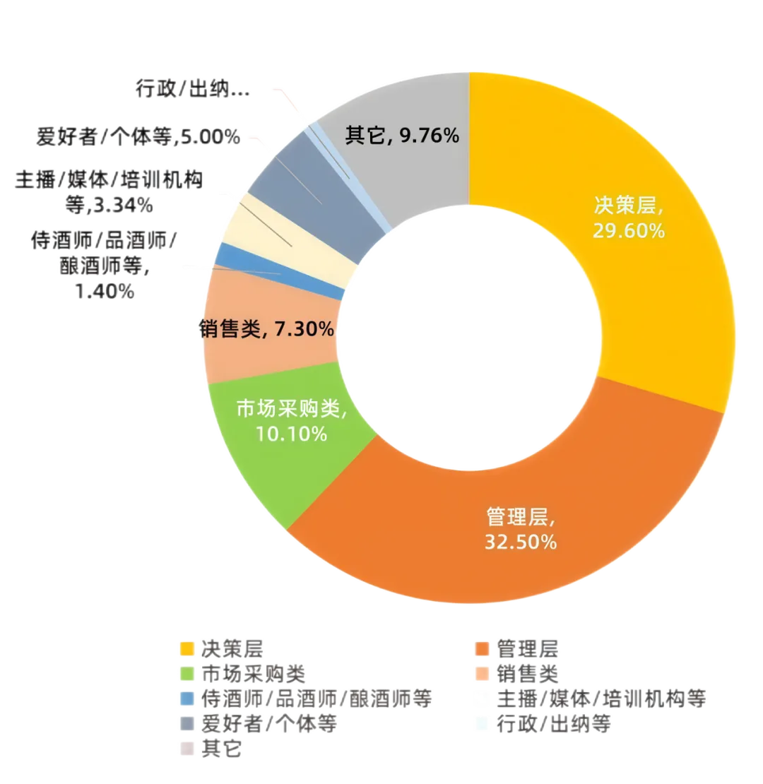 职务层级含金量突出,决策效率极高。管理层(32.5%)与决策层(29.6%)合计占比超过六成,意味着大多数到场观众拥有直接采购与合作决策权,现场签约与资源对接效率大幅提升。此外,市场采购、专业销售、侍酒师、品酒师,以及媒体KOL和爱好者群体齐聚一堂,既强化了专业深度,也促进了内容传播与跨界破圈。