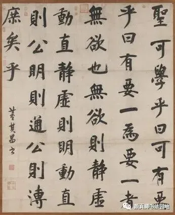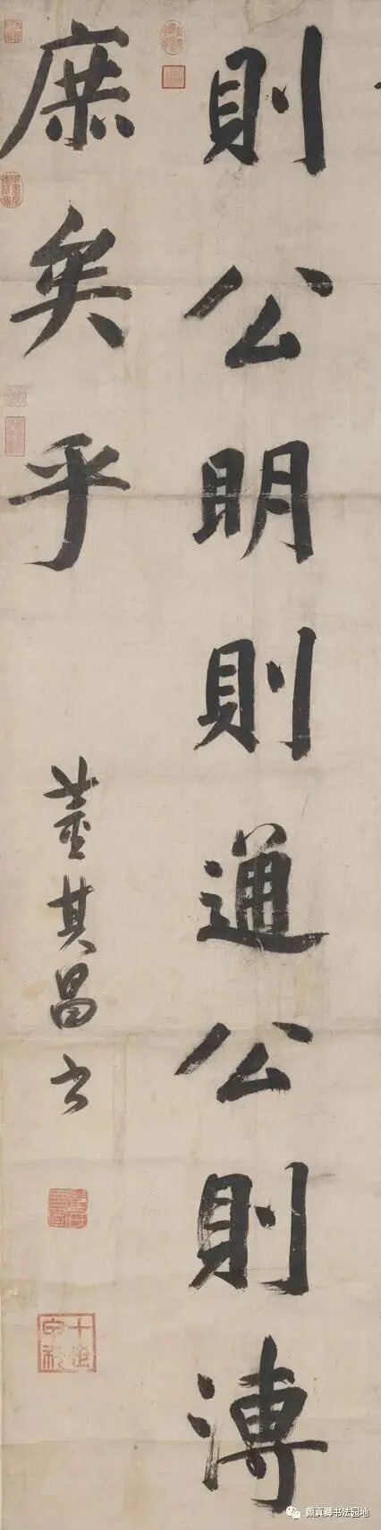 董其昌,字玄宰,号思白。江苏华亭人。万历十七年(一五八九)进士,官至礼部尚书,谥文敏。天才隽逸,善书画,富收藏,尤精鉴赏。临摹书迹,至忘寝食。行楷之妙,称绝一代。此轴为董其昌罕见的书法大轴,节录周敦颐(1017-1073)《通书》中内容,学者根据题款风格判断约书于万历三十九年(1611),属于他精力旺盛的中年时期,展现出他对于大字楷书书写的掌控与成就。