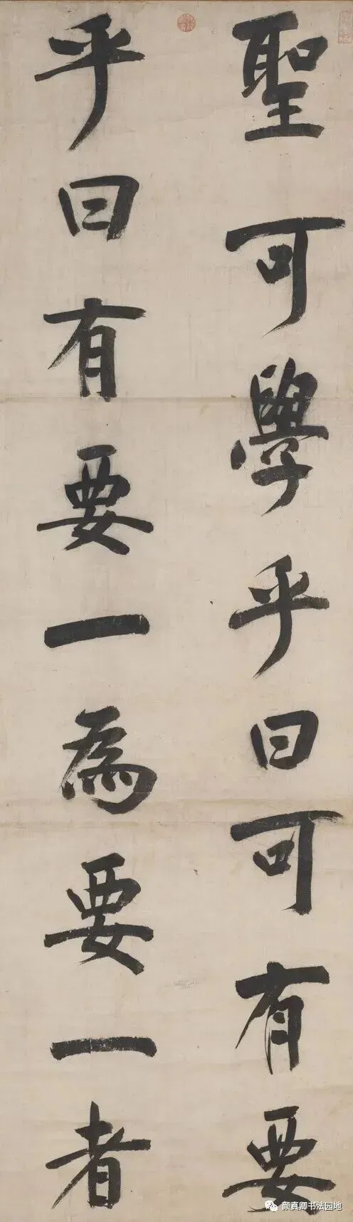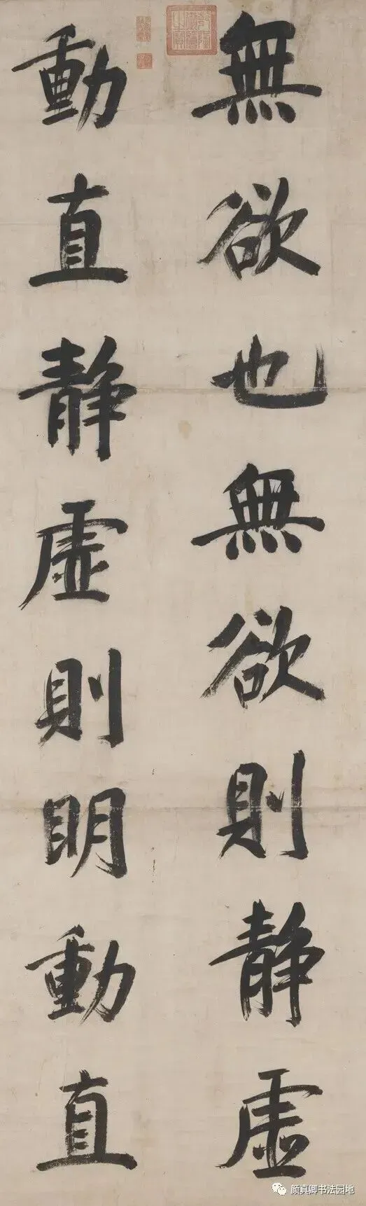 全作虽透露着浓厚的颜楷特征,作者却能摆脱颜真卿用笔和结字的外观形似,巧妙地转化成独特的个人面貌。用笔看似平淡却隐含变化,点画表现也趋向质朴苍劲,单字结体则是寓奇巧于平稳中,疏朗的间距透露出空灵的气息,整体达到一种既雄强又从容不迫的和谐境界。