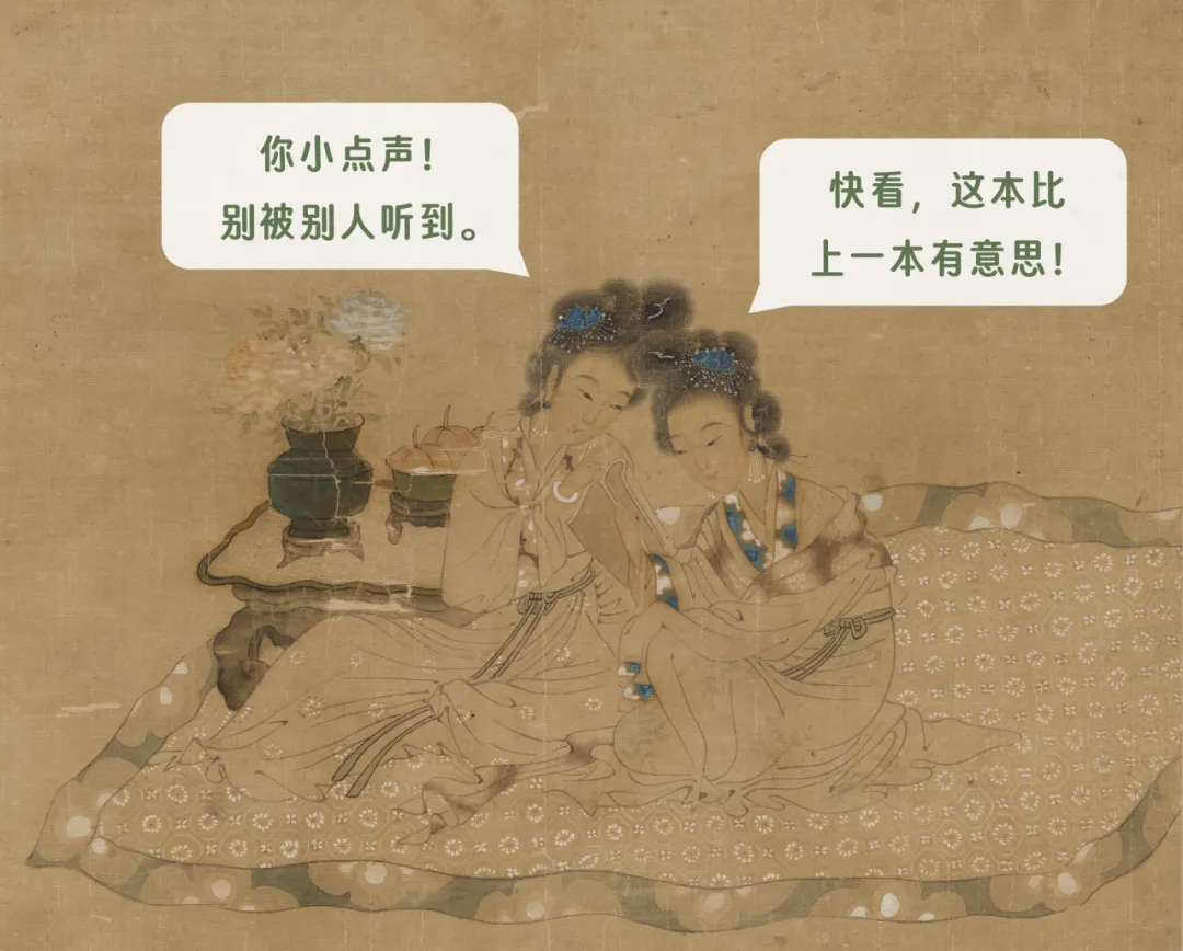 场景:两个女孩窝在榻上靠在一起偷偷看闲书。