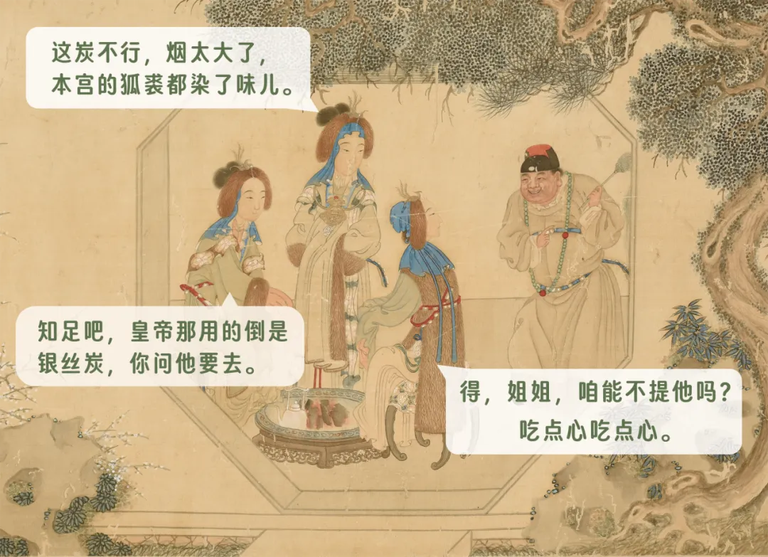 围坐于炭盆旁,一侧侍立着持拂尘的宦官。