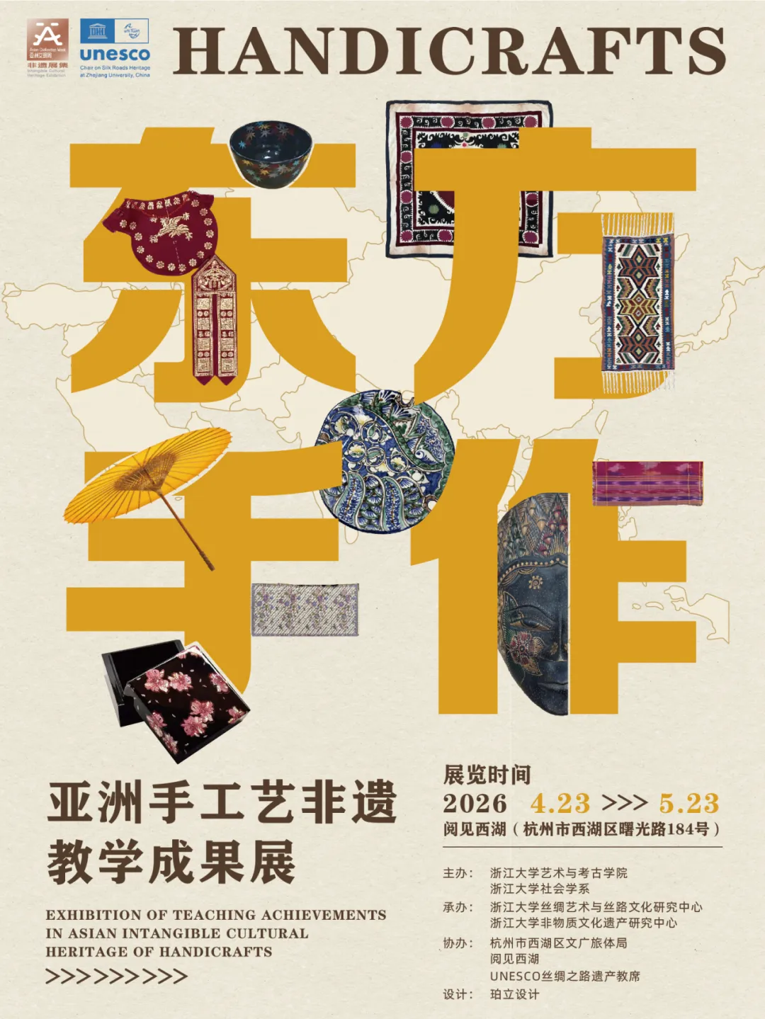 由浙江大学艺术与考古学院、浙江大学社会学系联合主办,浙江大学丝绸艺术与丝路文化研究中心、浙江大学非物质文化遗产研究中心承办,西湖区文化广电旅游体育局、阅见西湖协办,联合国教科文组织丝绸之路遗产教席支持的“东方手作:亚洲手工艺非遗教学成果展”,将于2026年4月23日至5月23日在杭州市阅西湖文化空间(晓风书屋)举行。