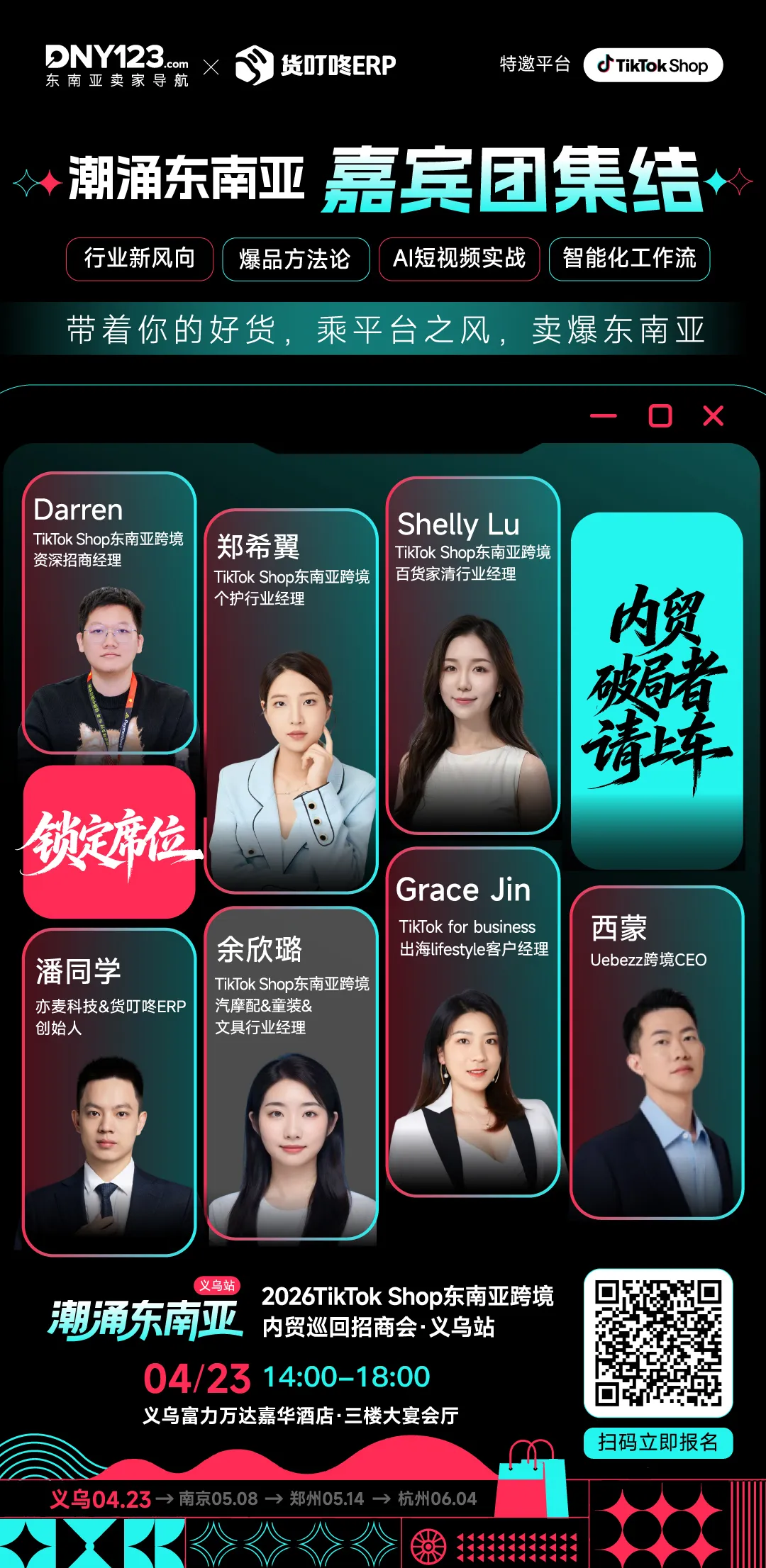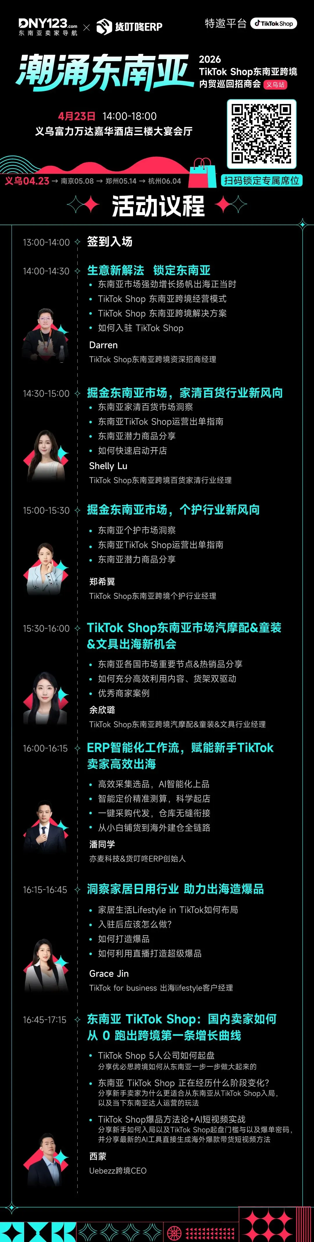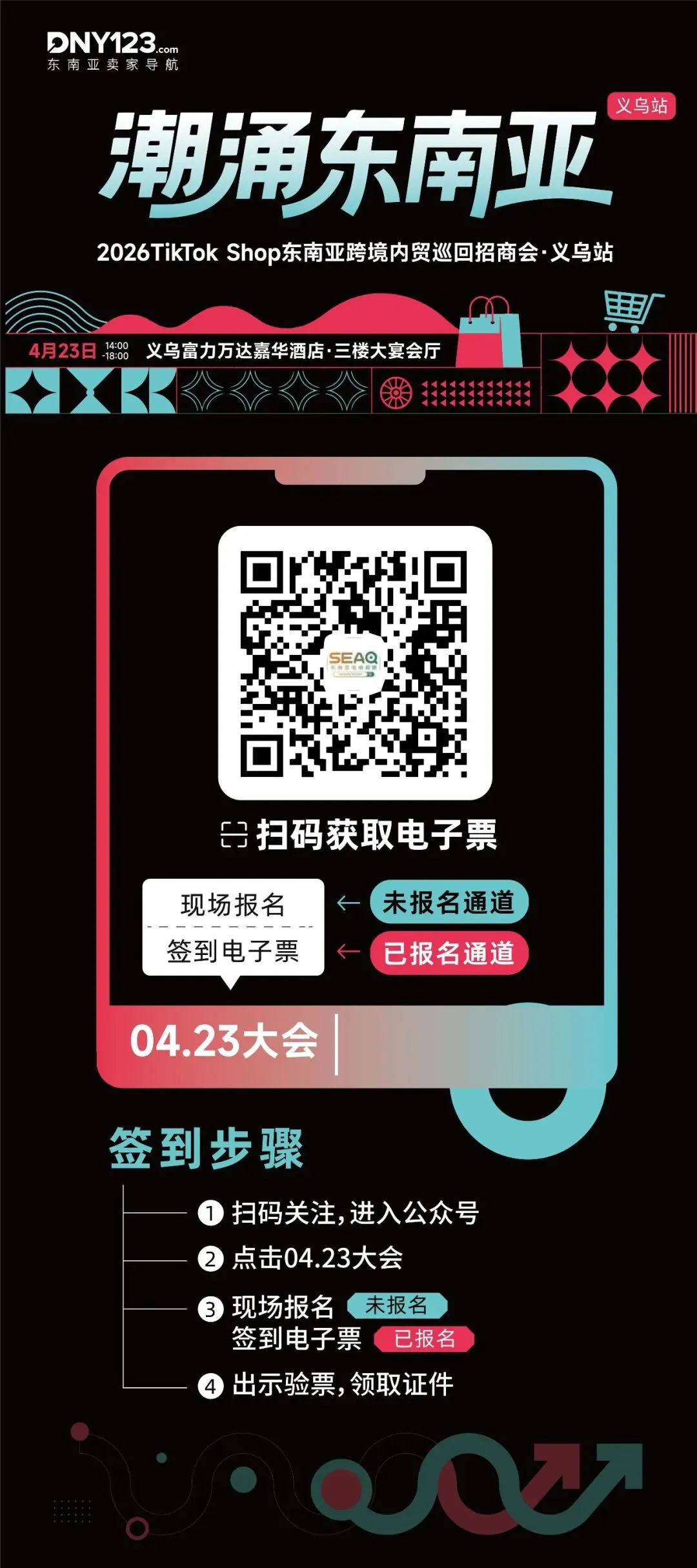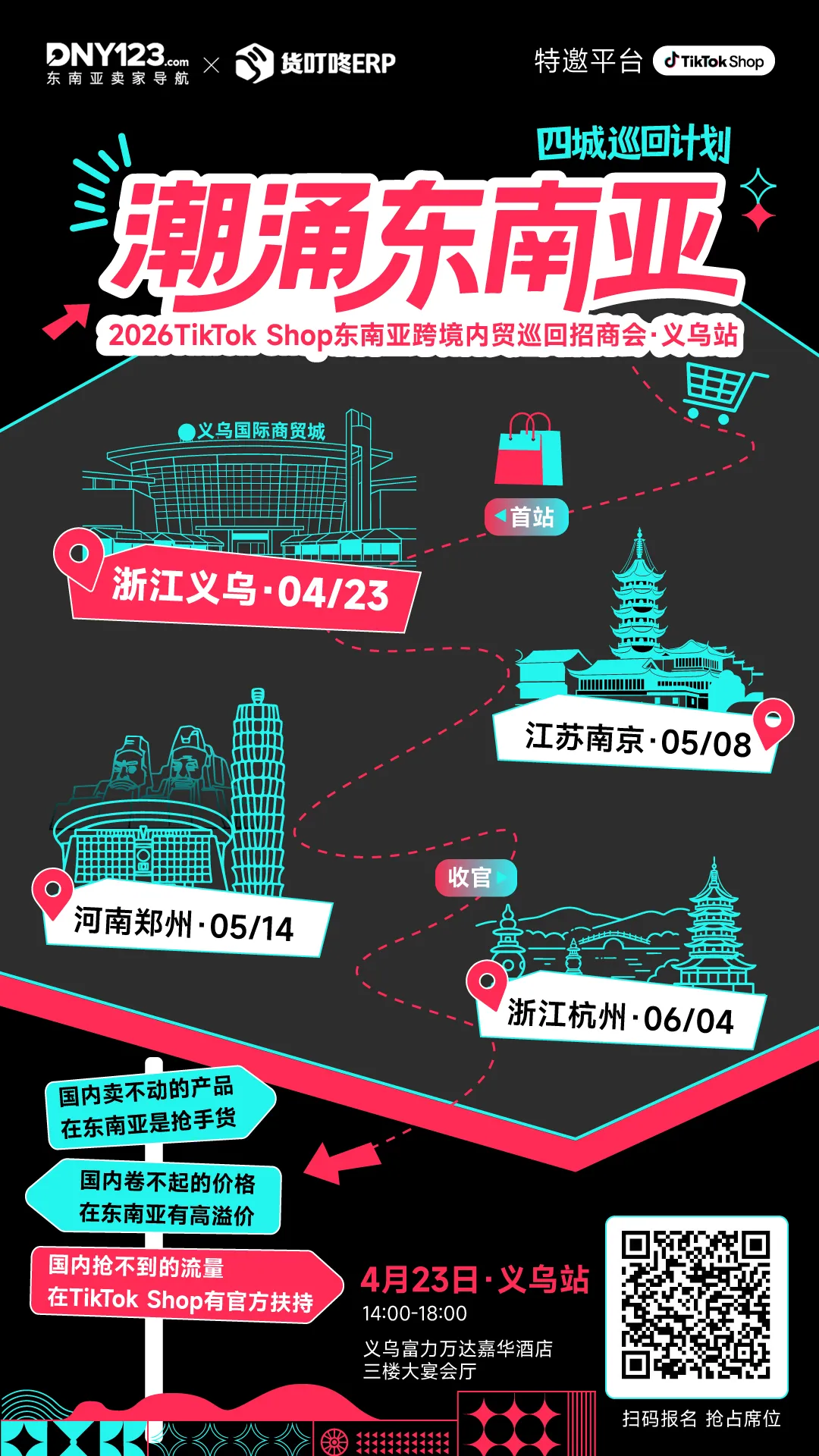 4月23日,【潮涌东南亚】2026 TikTok Shop东南亚跨境内贸巡回招商会·义乌站将在义乌富力万达嘉华酒店三楼大宴会厅隆重举行。