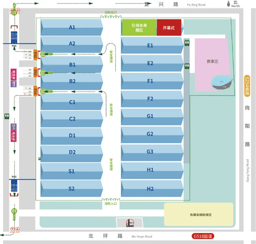 展会设置南北两个出入口,排队通过“安检区”,可在“换证处”凭进馆电子二维码换取观展证,通过“验证处”核查即可进入展馆。为合理分流,共设2个“换证处”和3个“验证处”,请大家到时根据人流量灵活排队,避免拥挤混乱。