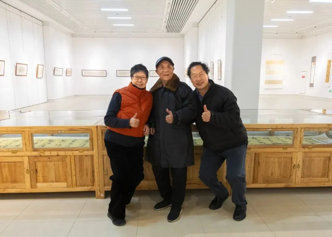 2026年1月21日,出品人刘云志(右)、策展人陈小波(左)与孟庆林老人在青岛画院展场会面。