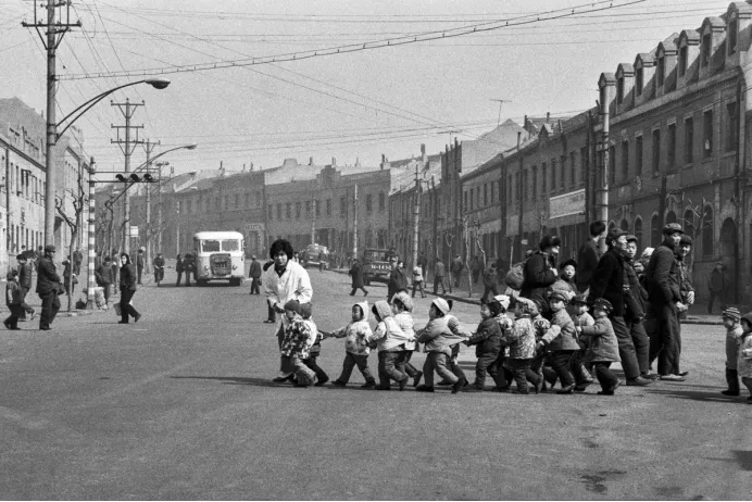 1980年代初,青岛冠县路路口,老师引导小朋友过马路。