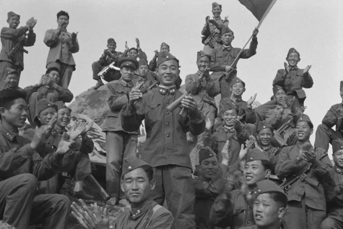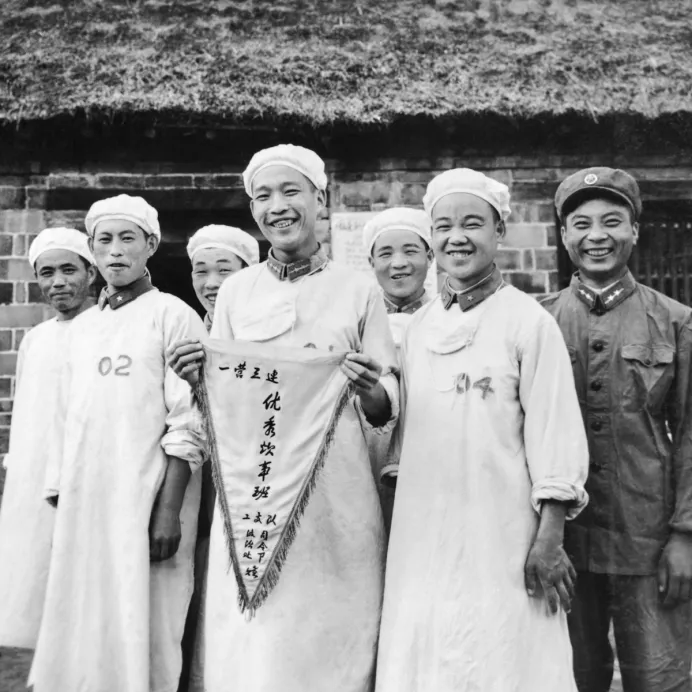 1960年代,67军200 师一营五连炊事班精打细算、厉行节约,在有限条件下精心调配伙食、改善官兵生活,深受战士好评。居中者为司务长。