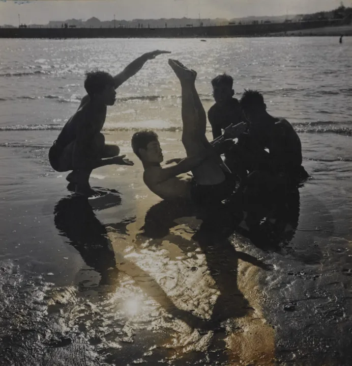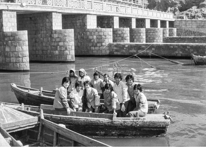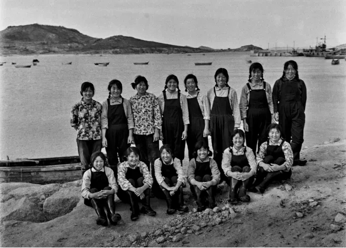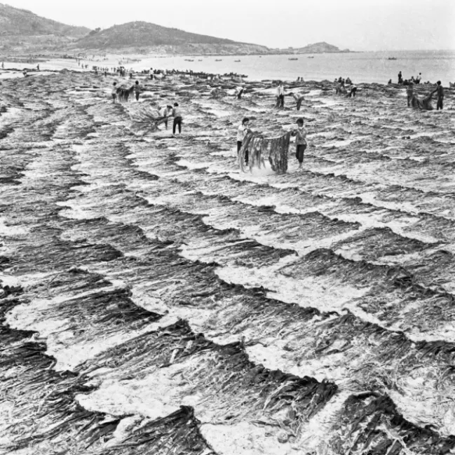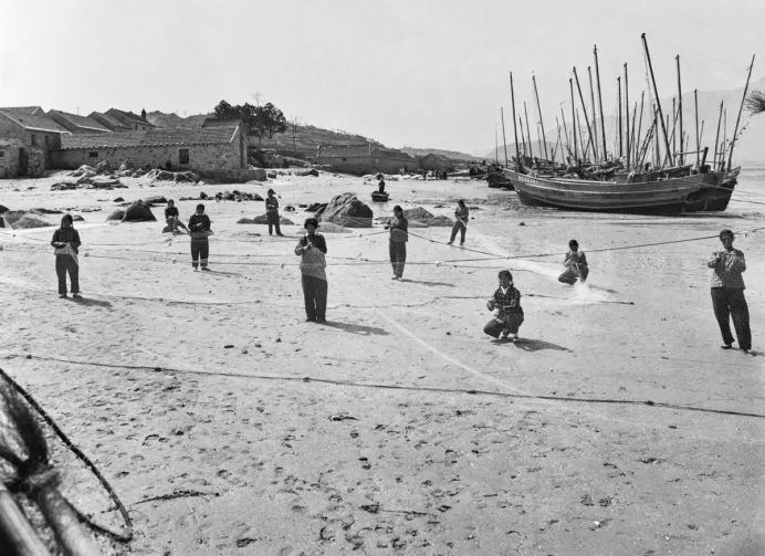 1970年代,胶东渔村退潮后,渔家妇女在沙滩上集体修补、整理渔网。当时渔业生产多以生产队为单位,男性渔民主要负责驾船出海捕捞,而女性则在岸畔承担整理渔网,修补渔具、晾晒渔获等后勤工作。