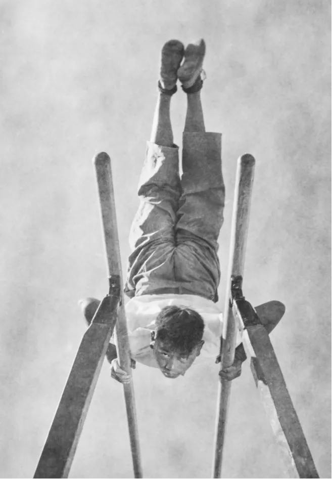 1960年代,67军200师战友李学华双杠表演,此动作为军事体能训练中的高难动作。