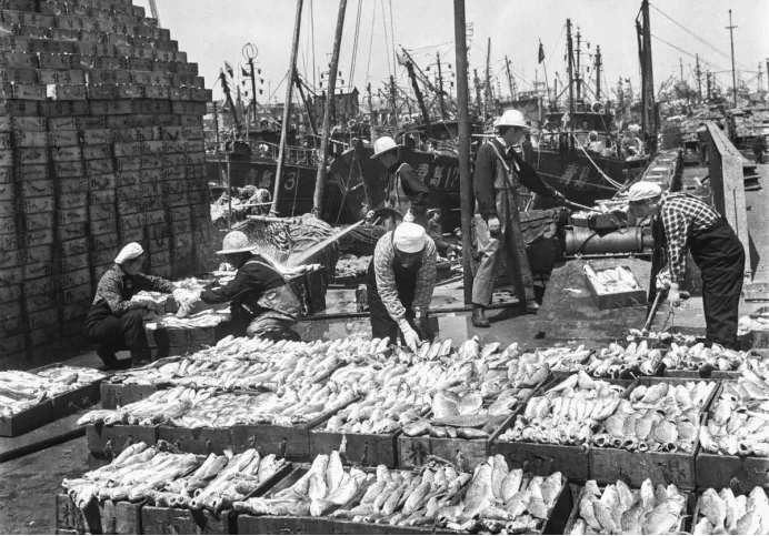 1974年,青岛小港繁忙作业。这一时期,青岛海洋捕捞进入机动化快速发展、外海捕捞扩大、近海资源开始衰退,在计划经济体制下,国营渔船远洋作业和社队集体近海捕捞成为两大主体。