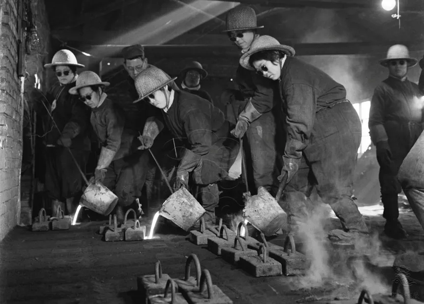 1977 年代青岛钢铁厂新招女职工练习金属浇铸作业。这一时期,青岛钢铁厂,是青岛唯一的大型钢铁联合企业,位于李沧区楼山后。