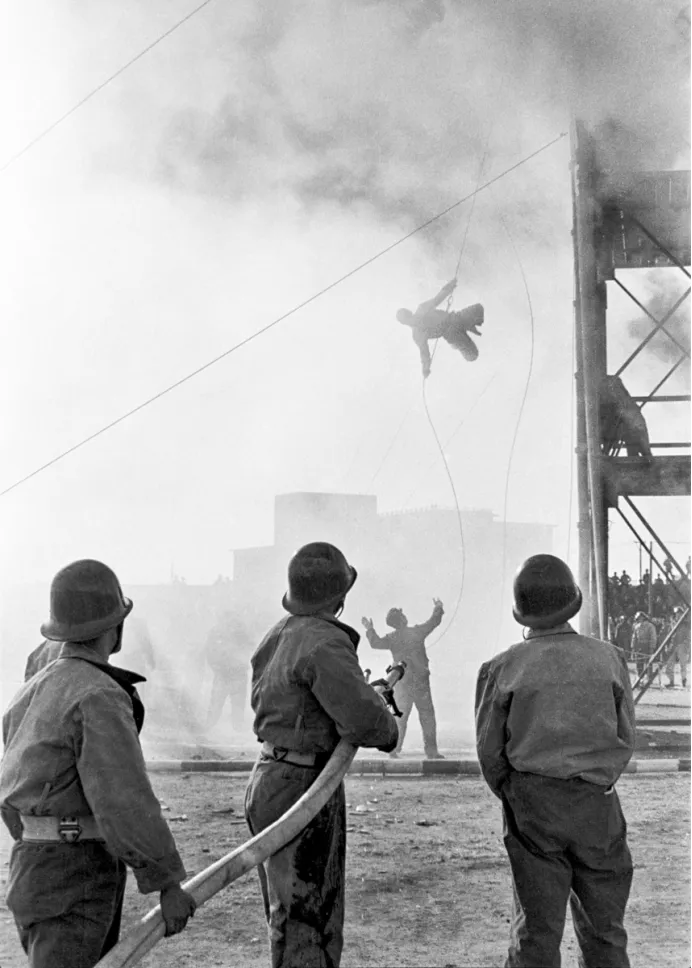 1978年10月,青岛市第三届消防运动会。这一时期,消防运动会主要围绕“两盘水带连接”、“攀登挂钩梯”、“百米障碍”、“着装登车”等硬功夫展开。