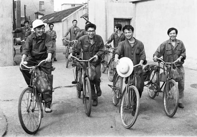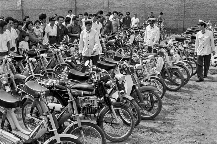 1980 年代青岛车管所首次办理摩托车挂牌的现场。1980年代初,为了控制消费,国家对摩托车实行严格的“控办”政策。