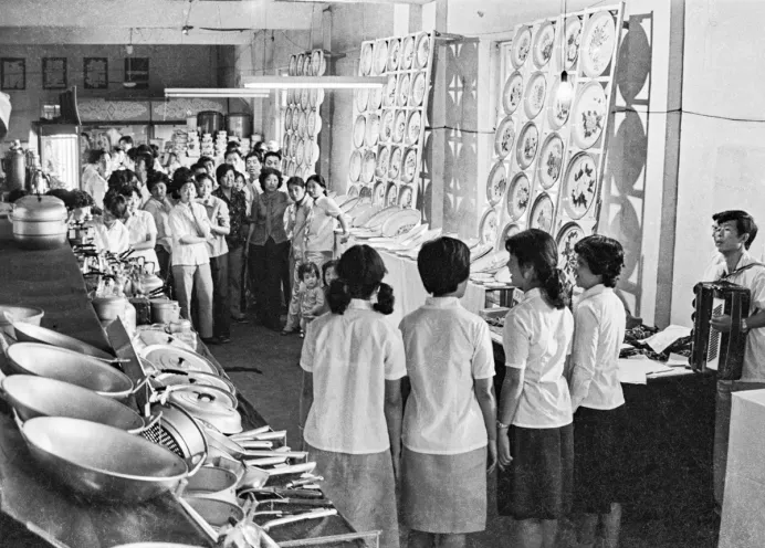 1980年代,青岛第五百货商场职工文艺演出。货架上铝制品皆出自青岛铝制品总厂(当年的“青岛钢精制品厂”),从锅碗瓢盆到行军水壶,几乎承包了青岛家家户户的厨房。