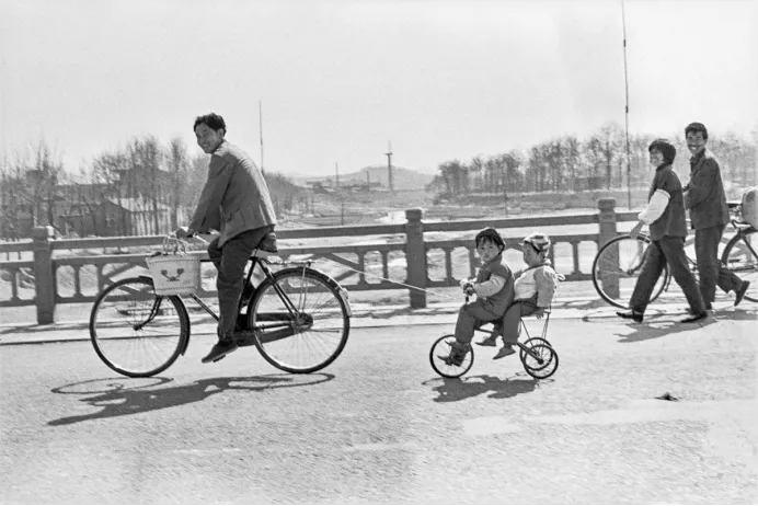 1980年代,李村河桥上“爸爸骑车、孩子牵引”,这一时期,自行车是当时主流交通工具。